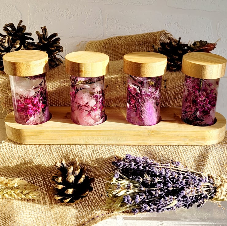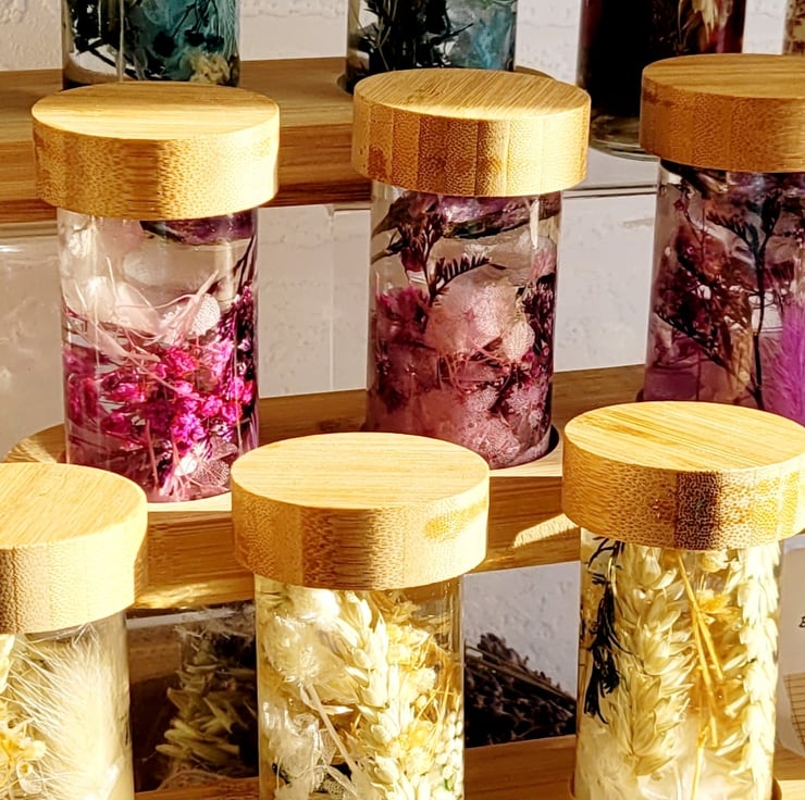 Dried flowers in a mineral oil herbarium bottle create a captivating display where delicate blooms are suspended in clear liquid, preserving their beauty.