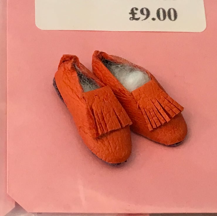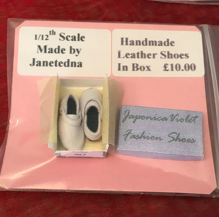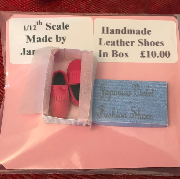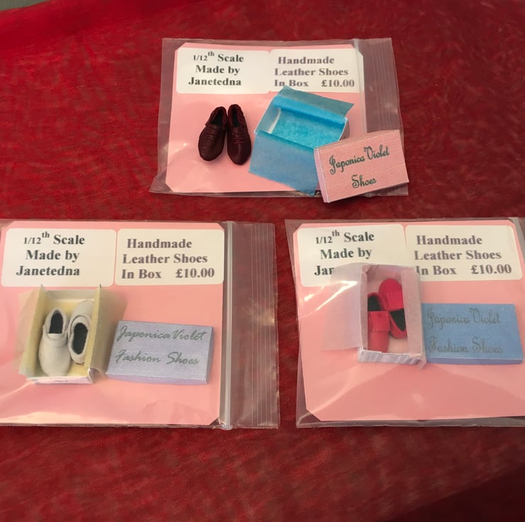 A variety of shoes, in 1 / 12 th scale, made in very fine leather, to add to rooms in your dollshouse ( the lady of the house has just kicked them off) or even a shop, as some pairs are boxed with a printed lid.