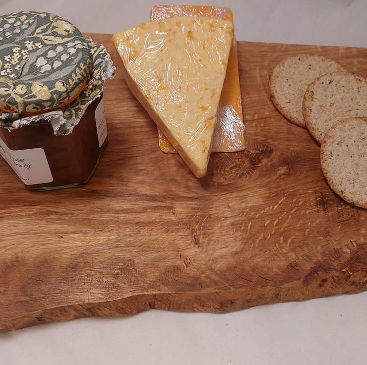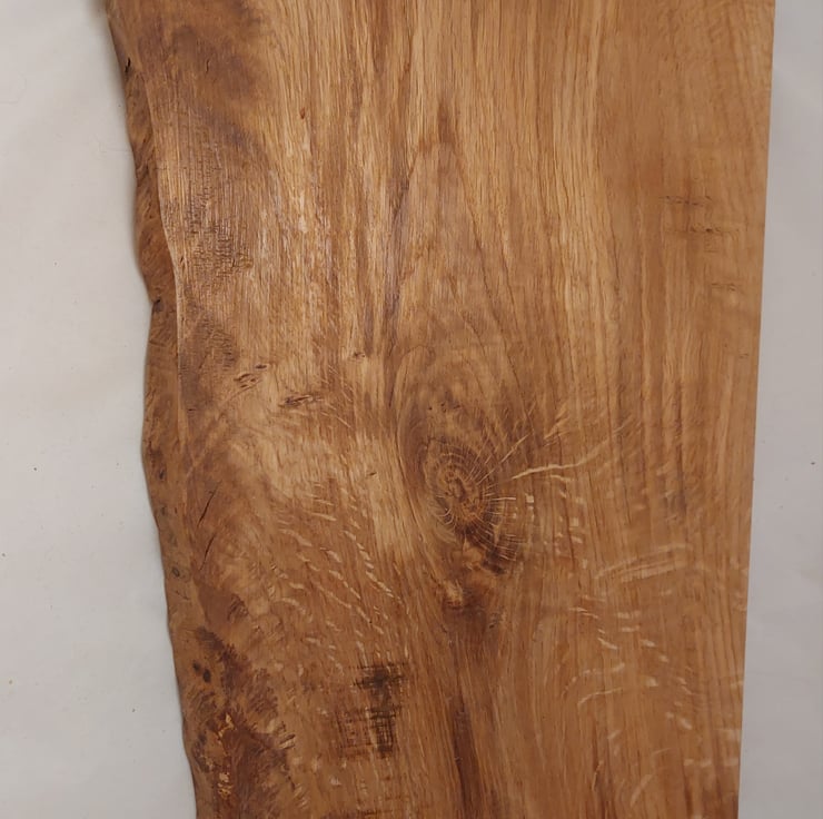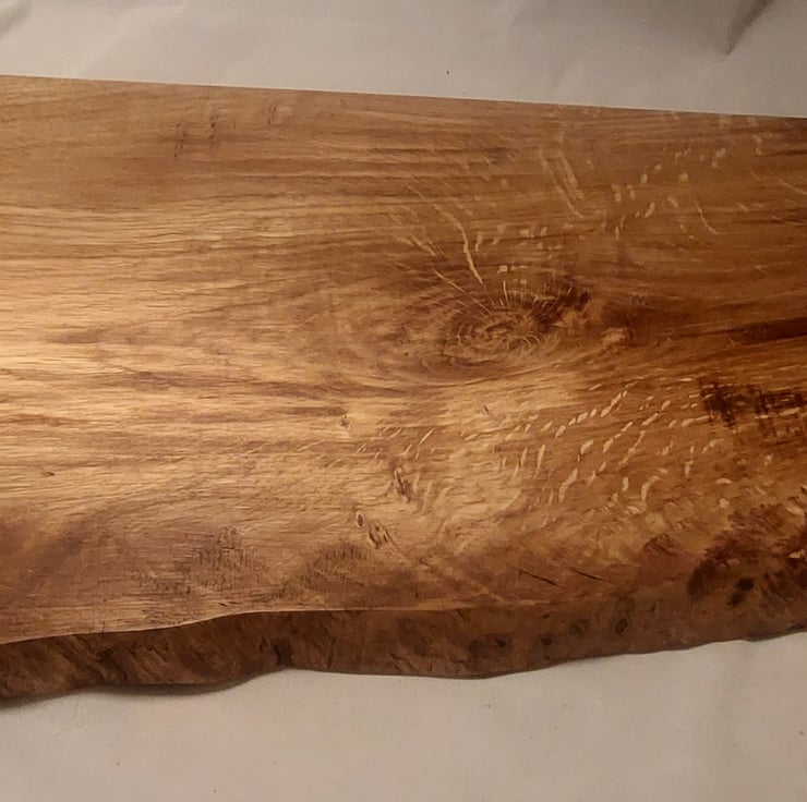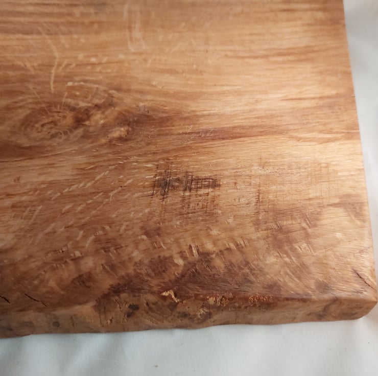 Handcrafted waney edge tiger oak wooden chopping board or cheese board. Treated with natural food safe oils and waxes. Features non slip feet. Measures approx 22x34cm.