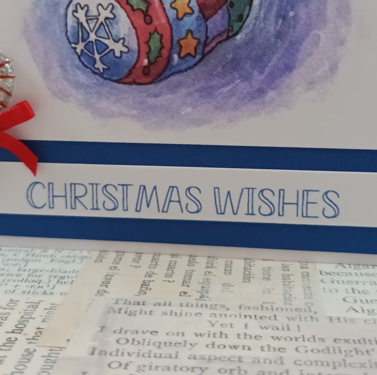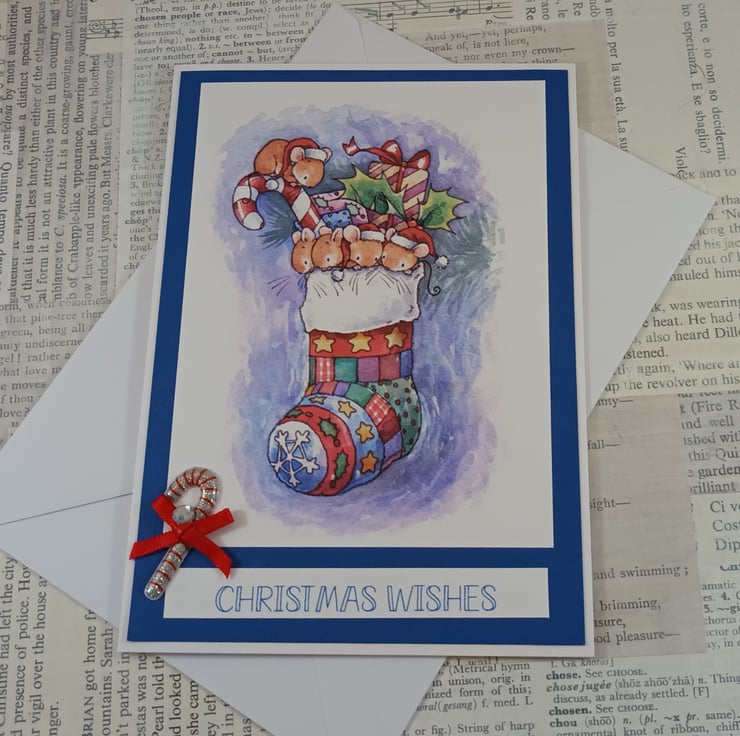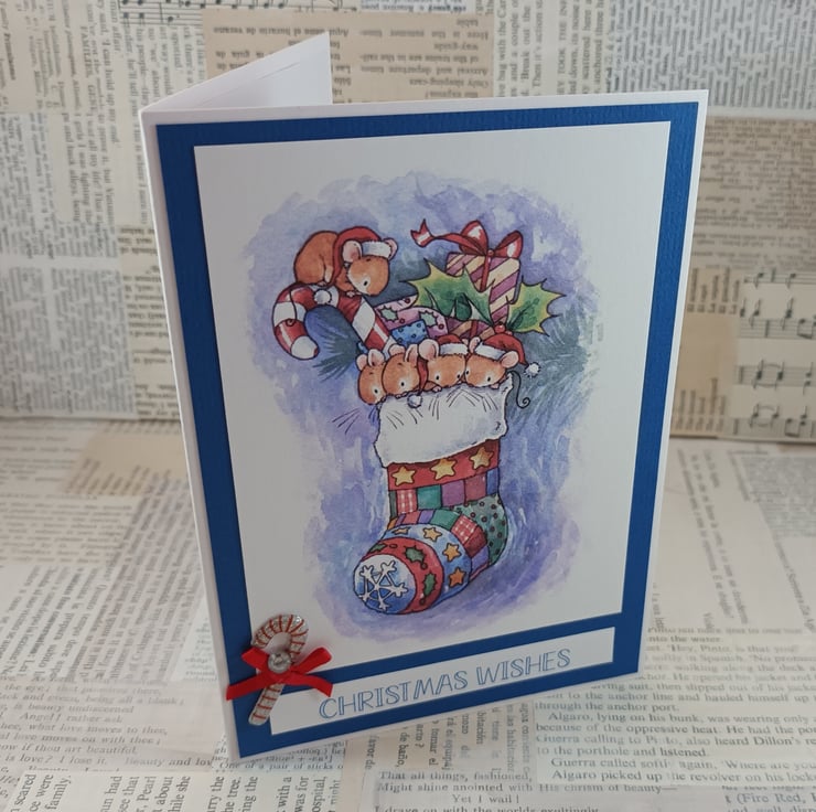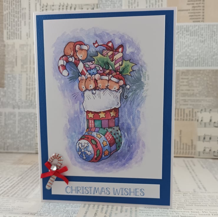 A6 Christmas card featuring a cute image of a group of mice snuggled up in a Christmas stocking. The image has been overlaid onto dark blue card, together with the sentiment 'Christmas Wishes' and has a small candy cane embellishment added.