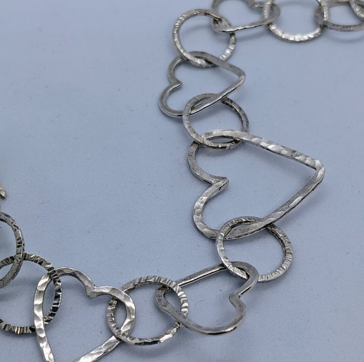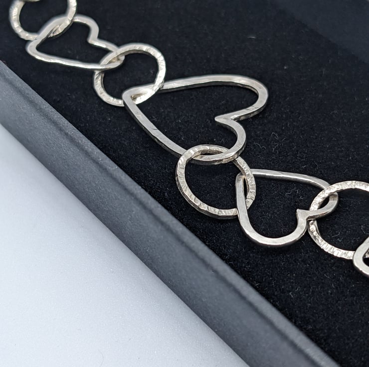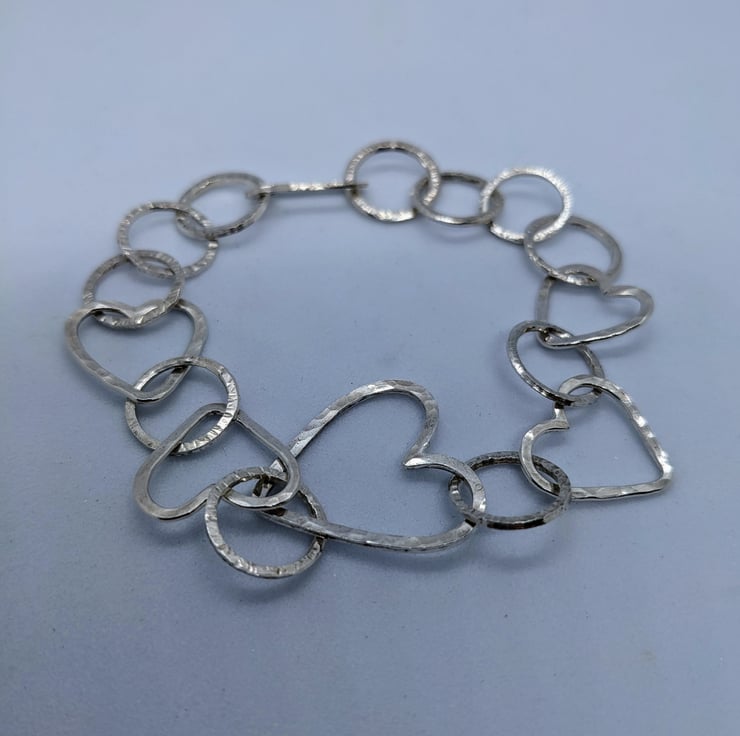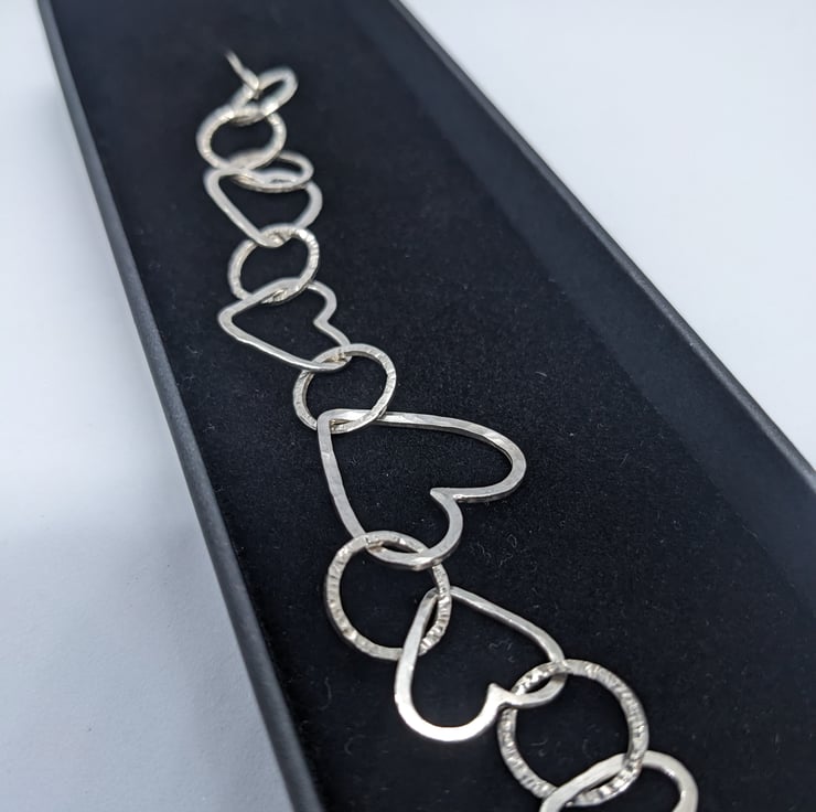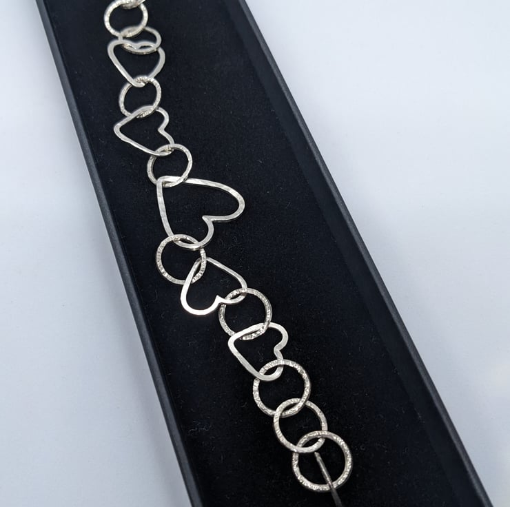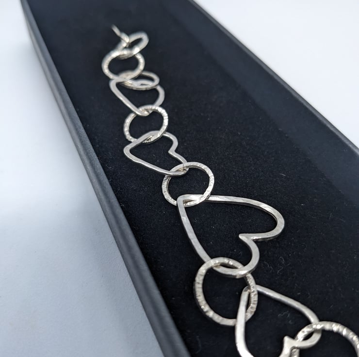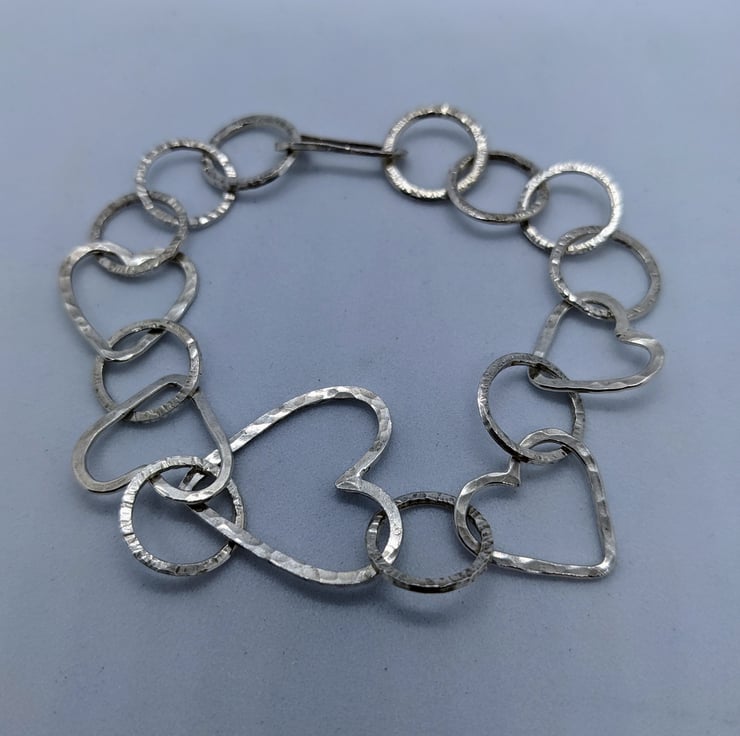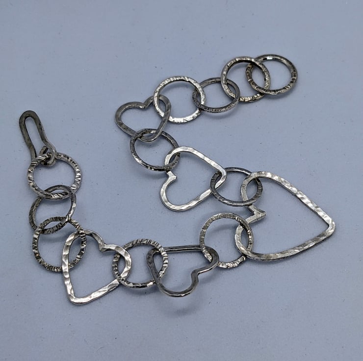 This bracelet is made from five handcrafted hammered heart links and textured rings of various sizes. The bracelet is secured with a handmade clasp and measures 18.5 cm. It would make a perfect silver jewellery gift for anyone who loves original jewellery.