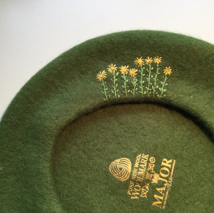 100% pure new wool, Woolmark, Beret embellished with hand embroidery of an imagined row of yellow daisies with dark green stems.