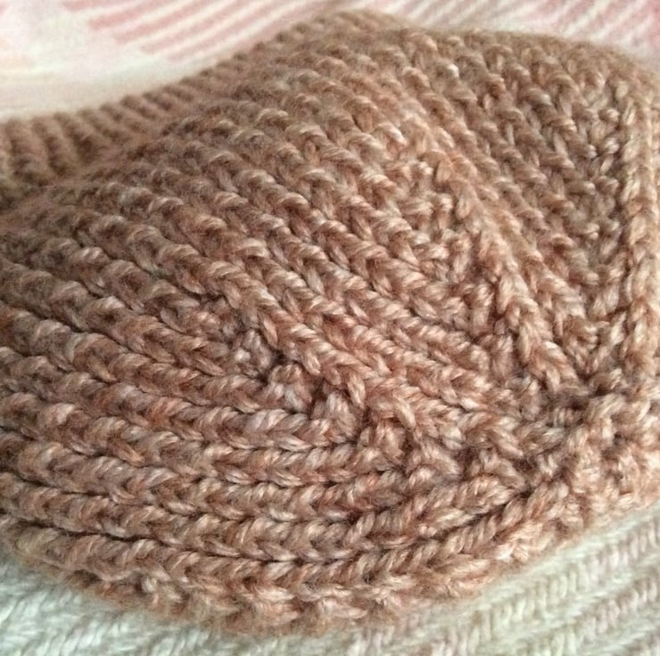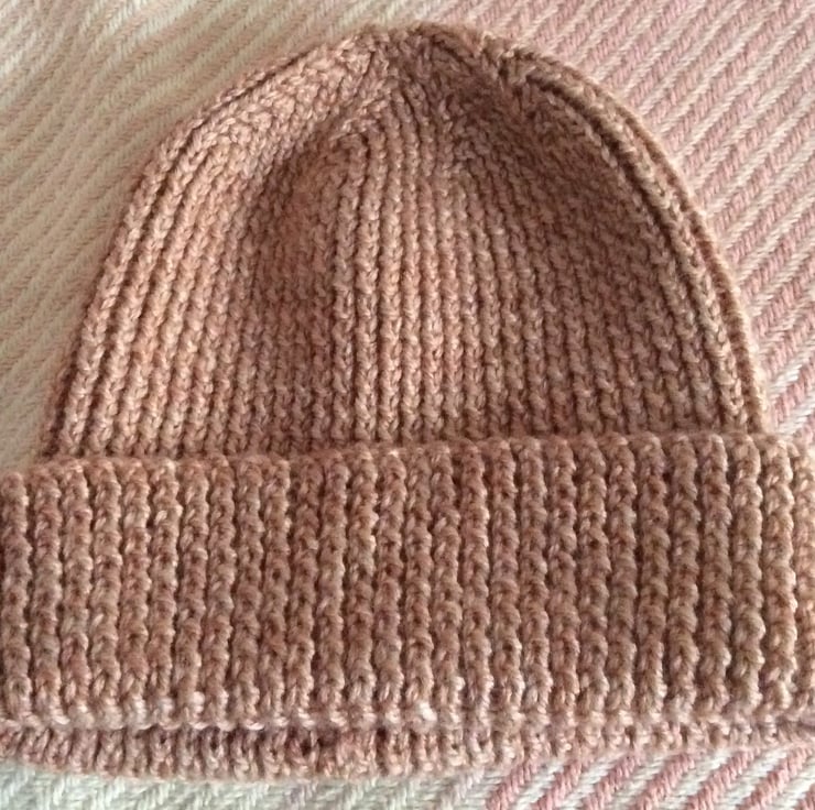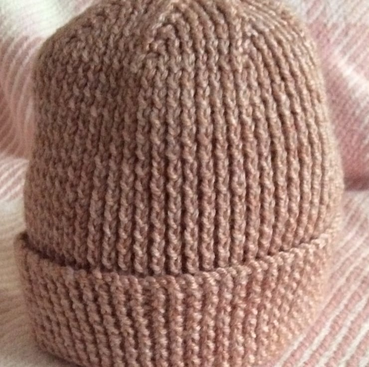 Hand knitted Beanie Hat, made using an acrylic wool yarn in a light brown beige colour.