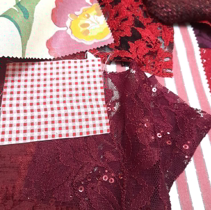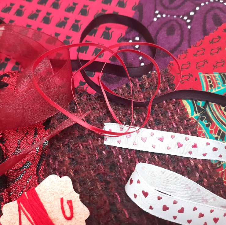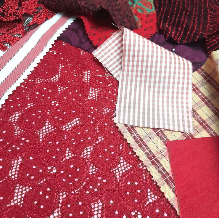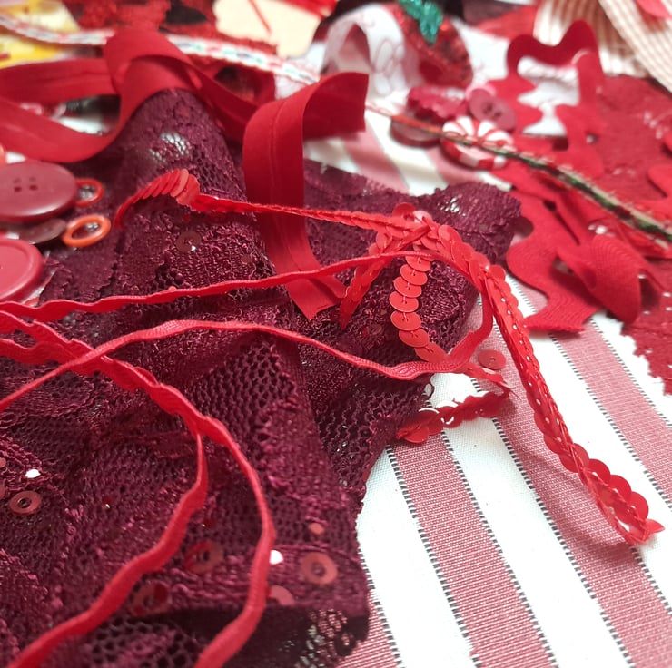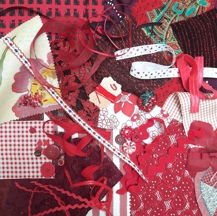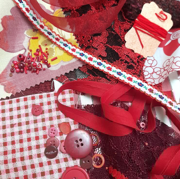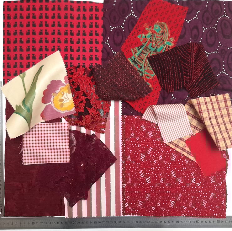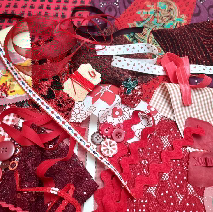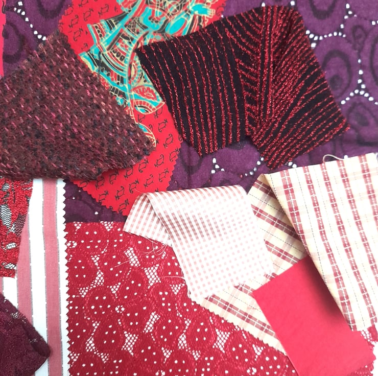 This box has a red colour theme, each box is very slightly different but you will receive mostly of what is in the photos. Variations are with the cut of the fabrics and maybe one of the patterns. The fabrics are a mixture of natural and man-made - fabulous colours and textures.