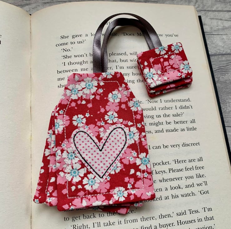 A red & pink tea bag bookmark, perfect for the tea drinking book lovers.
