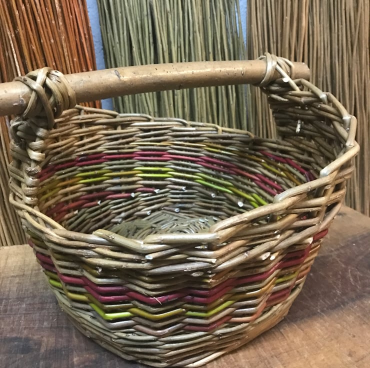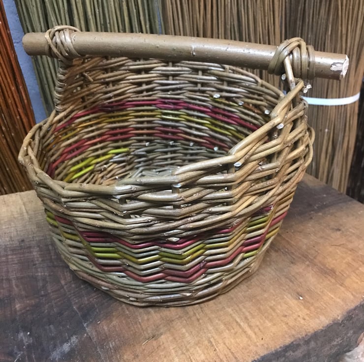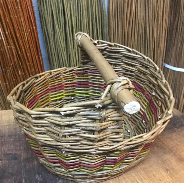 Rustic willow asymmetric basket slow crafted in Wiltshire from local willow and coppiced hazel - a great centerpiece , fruit basket , egg basket , berry picker and many other uses . The wood handles are sourced from local coppiced woodlands in the Winter , seasoned and shaped to provide an unusual feature handle .