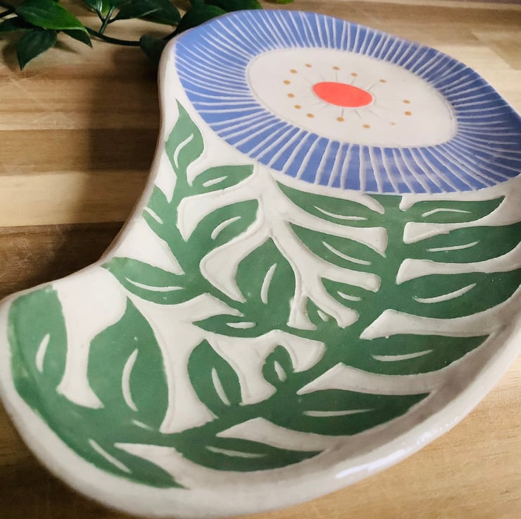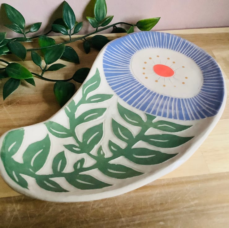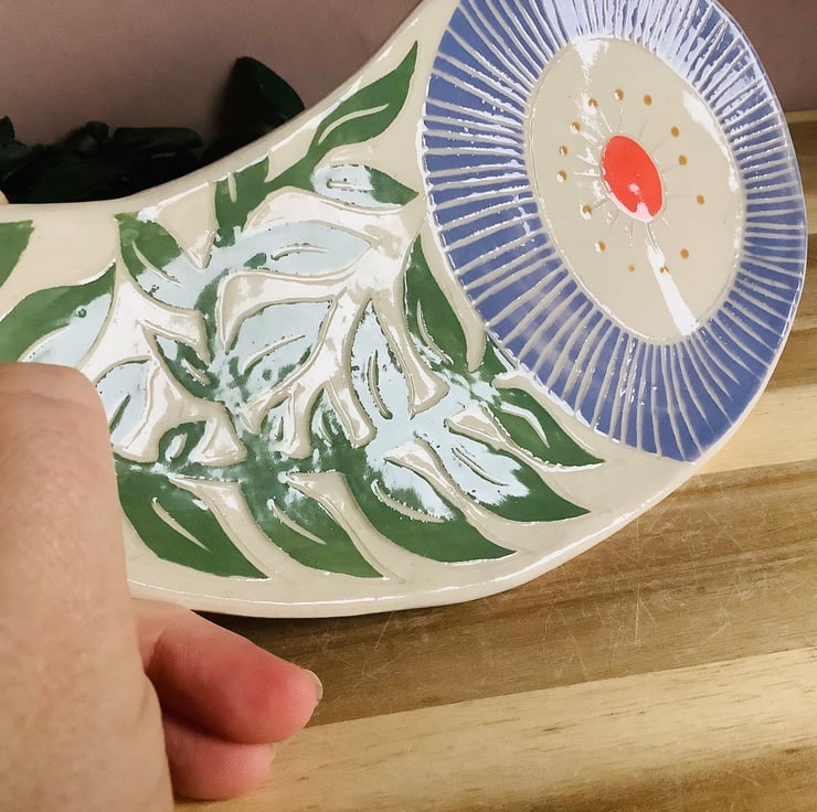 The design is carved into layers of coloured slip by hand making each one slightly different and unique.