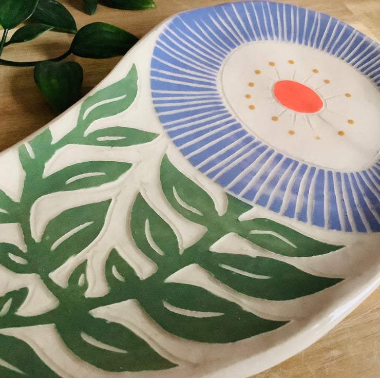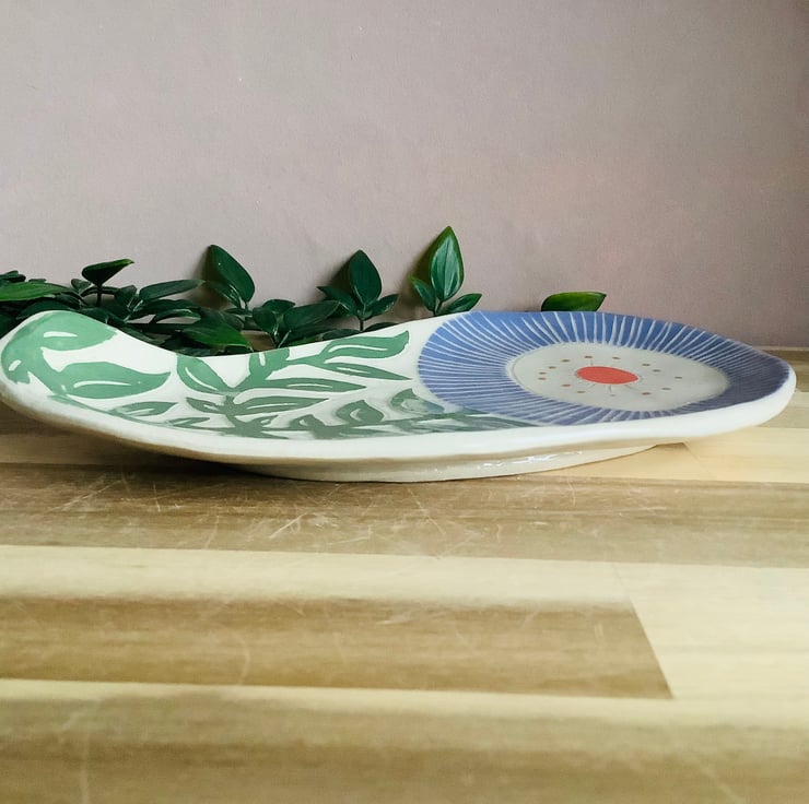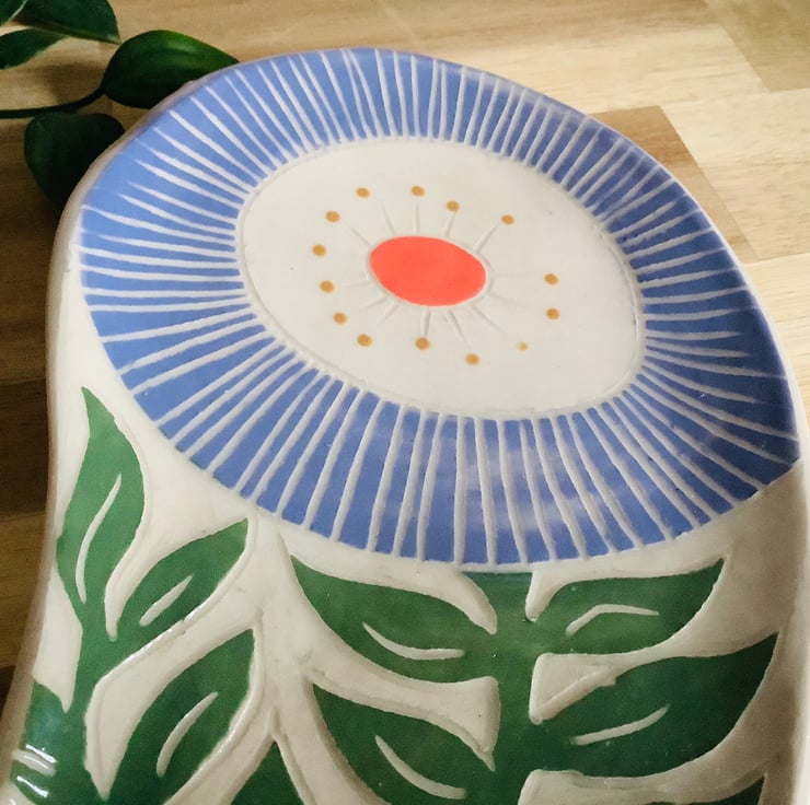 Handmade retro inspired floral plate. This fun retro flower plate is cheerful and stylish and is the perfect size for sandwiches salads and snacks, it’s also great as a large coaster with extra room for biscuits.