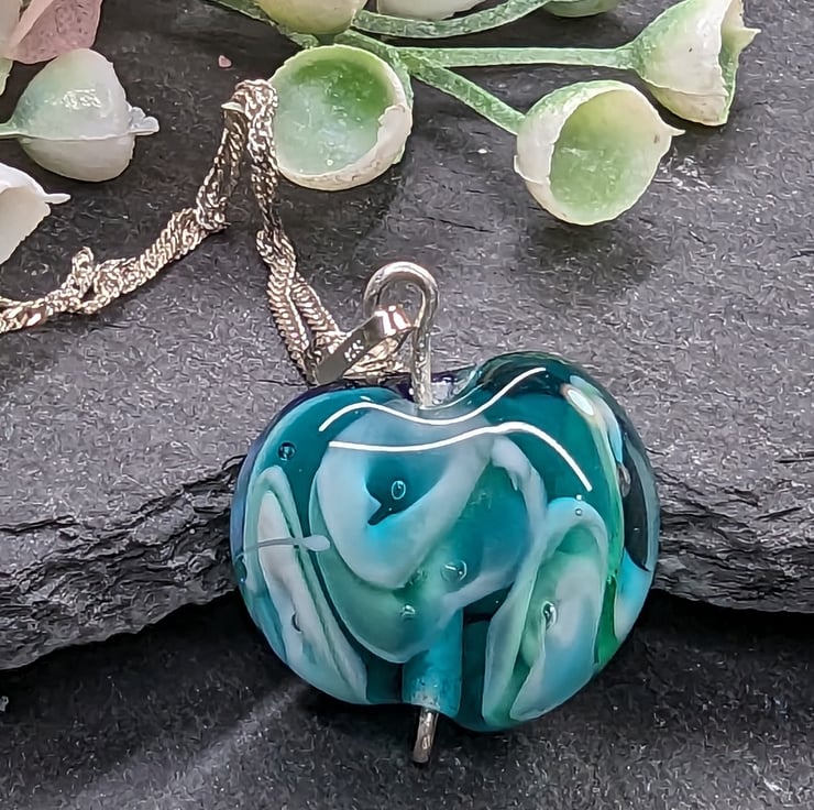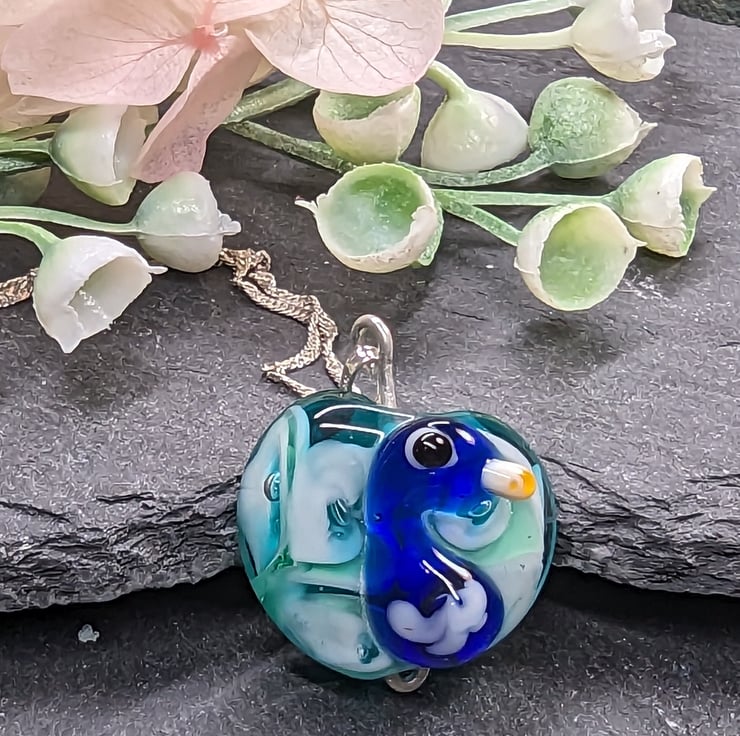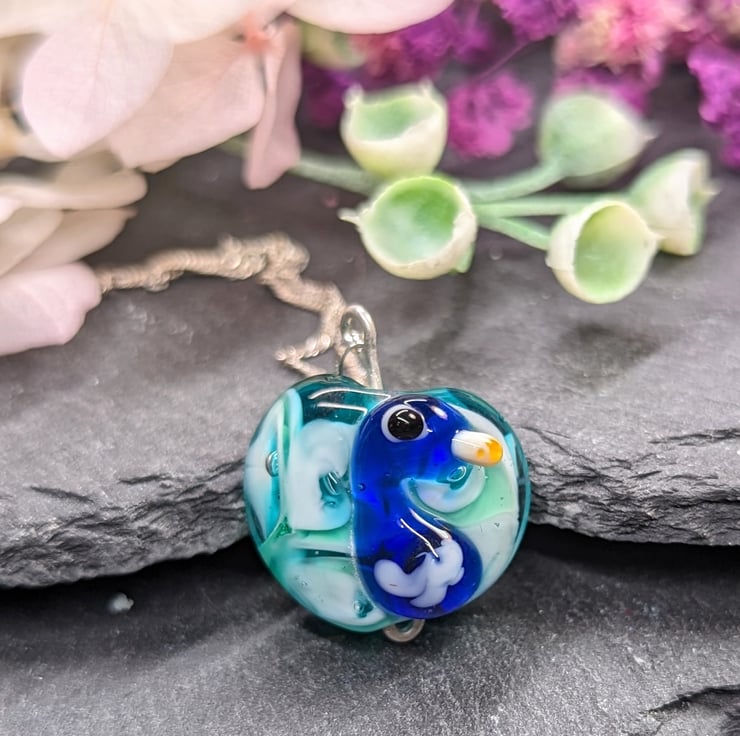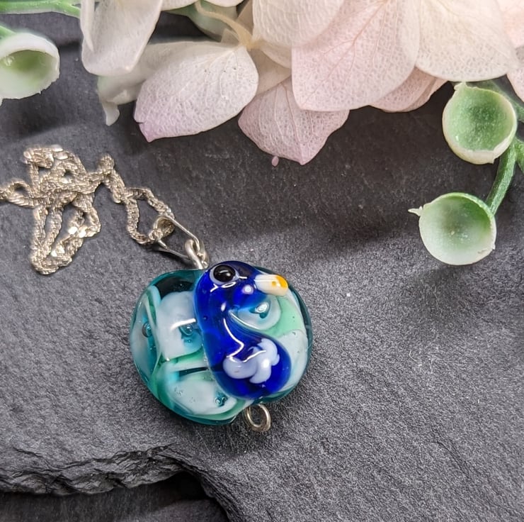A bespoke lampwork peacock necklace with vibrant blue and teal plumes - a quirky necklace for any nature lover. The transparent blue and teal glass has been melted in layers to create a feather effect and then poked with a tungsten poker to create an air bubble. The bead has then been encased with clear glass for added depth. The lampwork bead starts life as simple glass rods that I melt in the flame and onto mandrels. I then add layers of glass and continue to melt and shape in the flame - picture 9 shows the process.