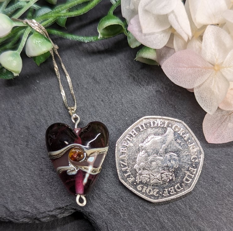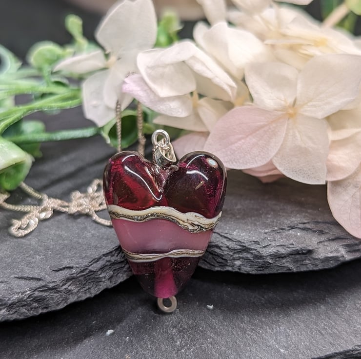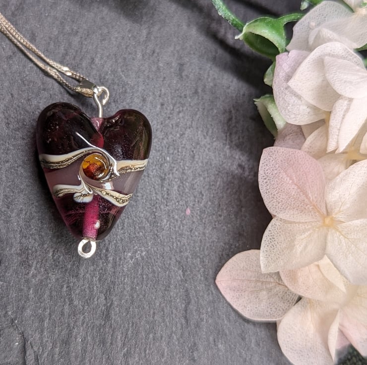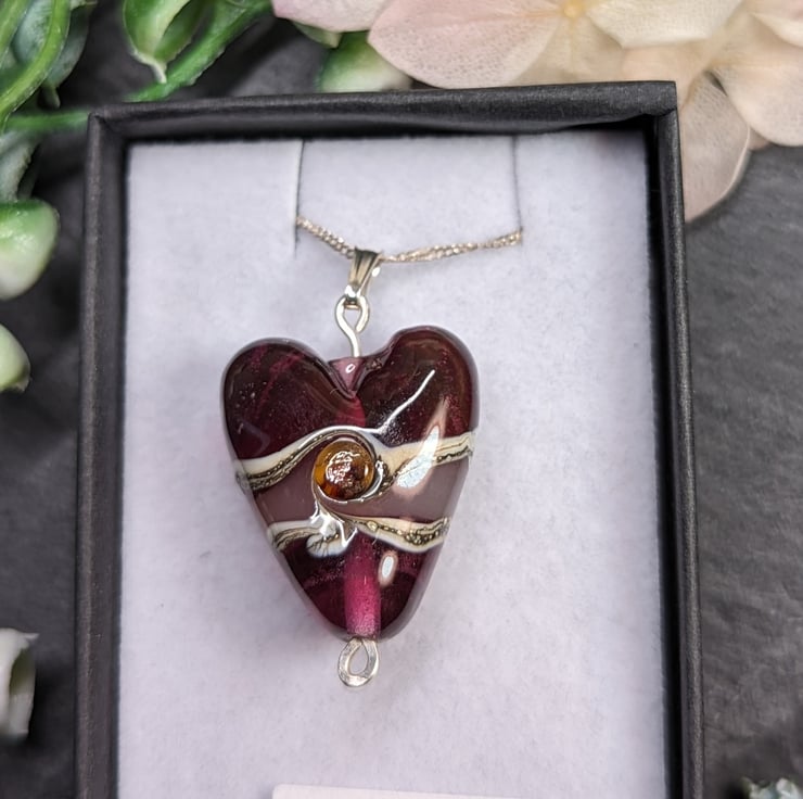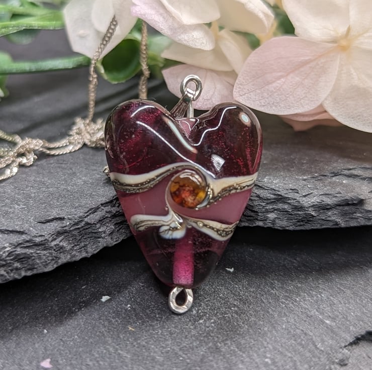 A bespoke lampwork love heart glass pendant featuring pink hues and a ripple swirling design. The love heart glass pendant has an amber coloured feature at the centre of the ripple design.