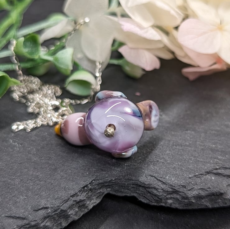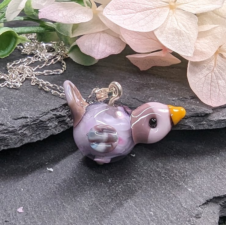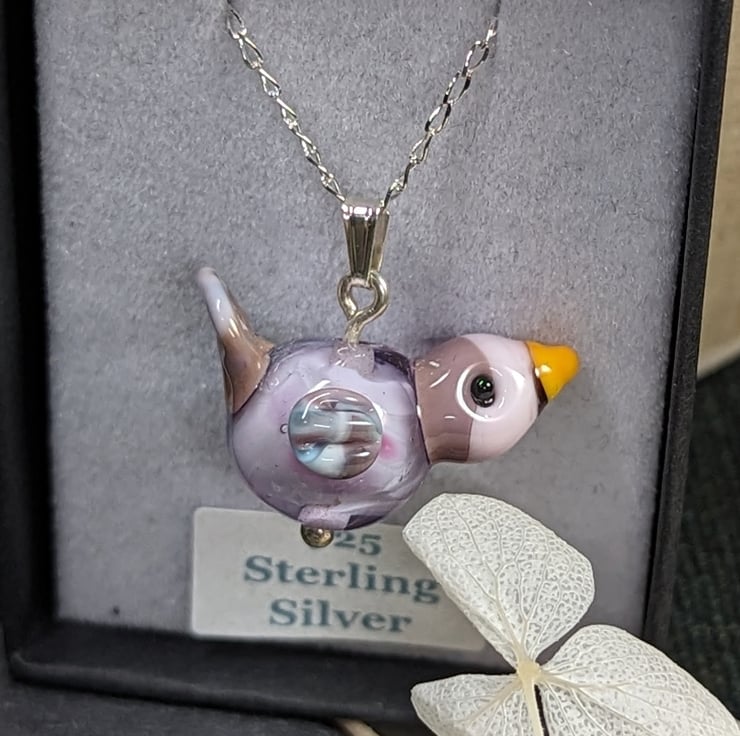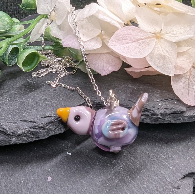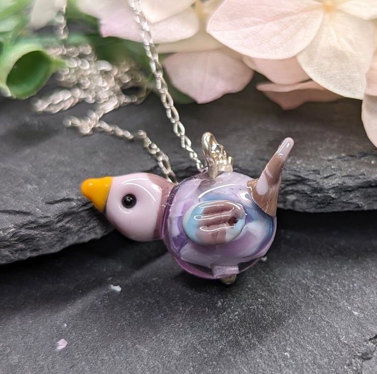 A bespoke lampwork glass bird necklace featuring purple and pink hues. The glass bird has been made by melting opaque and transparent glass rods (using a specialised flamework torch) onto a mandrel and then building up the layers to finally shape into a bird.