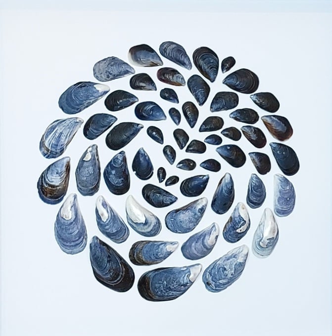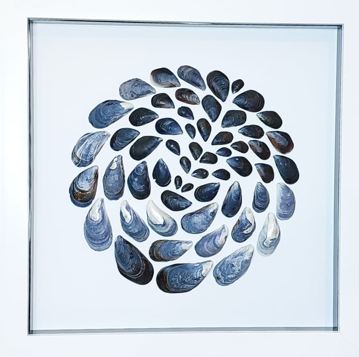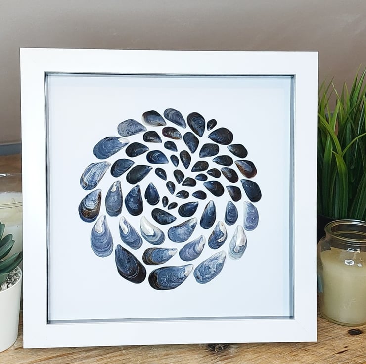 This 9in x 9in white frame with black insert. Holds this lovely Cornish shell artwork. All the shells are found on my local beach in Cornwall. Then turned into this simple yet effective circular art.