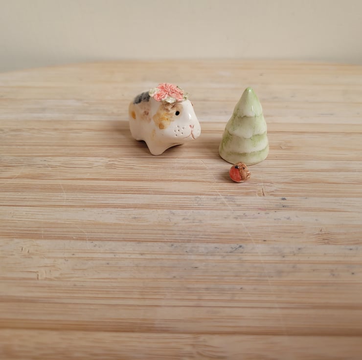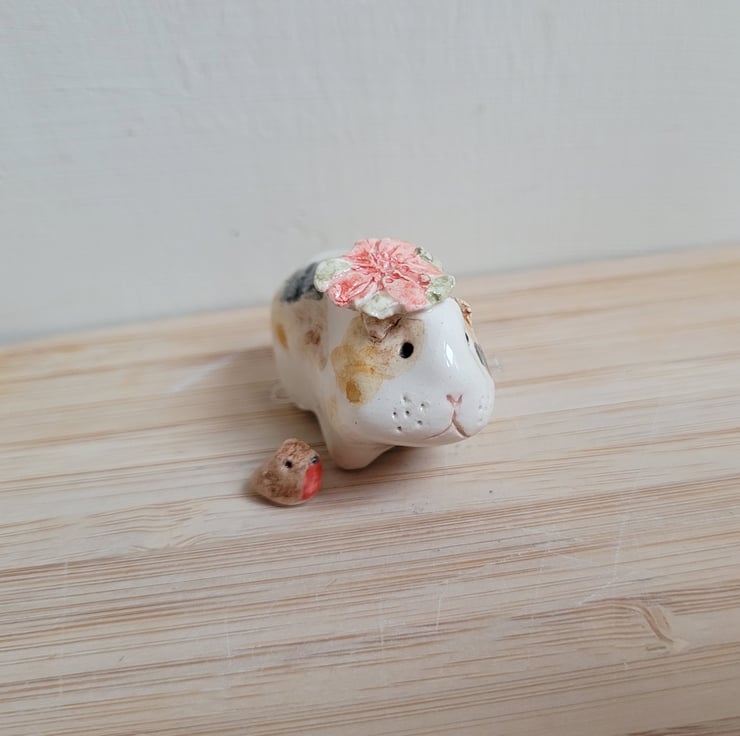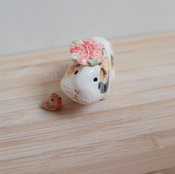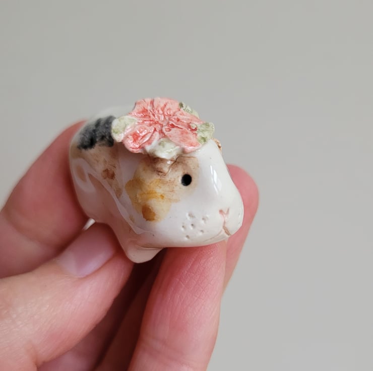 Hand made guinea pig sculpture in tri colour with a red Christmas flower - a little pocket pet friend for piggie lover .
