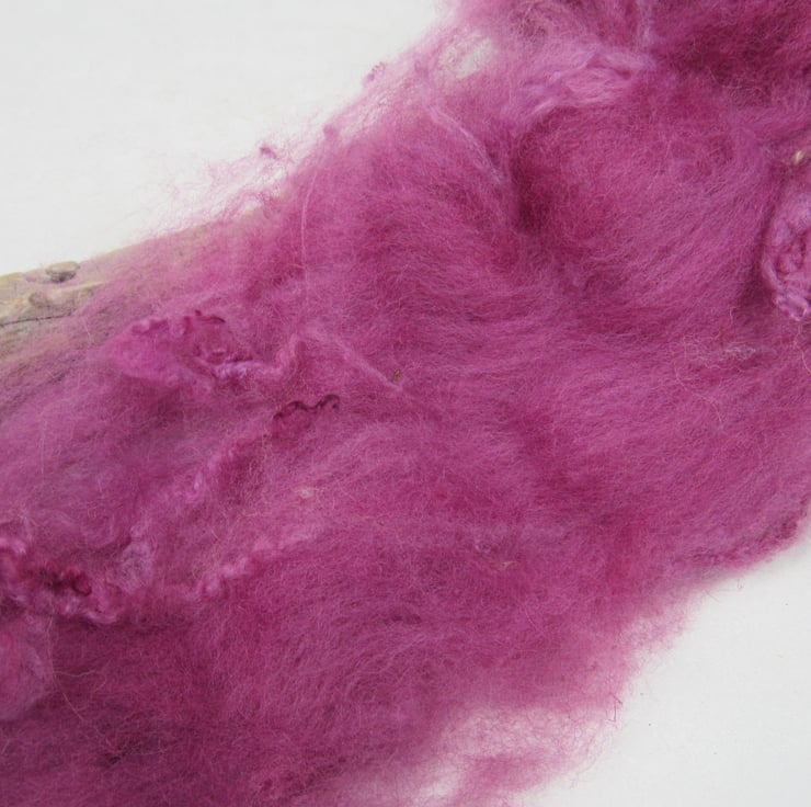 The fleece was cleaned, washed and carded here in North Wales before being kettle dyed with cochineal to a rich pink