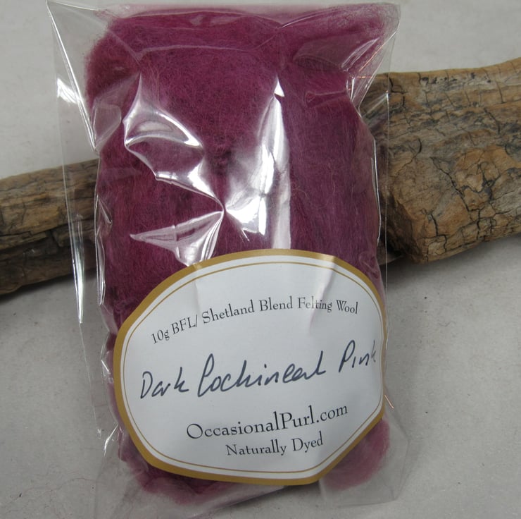 10g of blended Blue-Faced Leicester (for texture and crimp) with Shetland (for smoothness) wool naturally dyed and ready for felting, spinning or weaving.