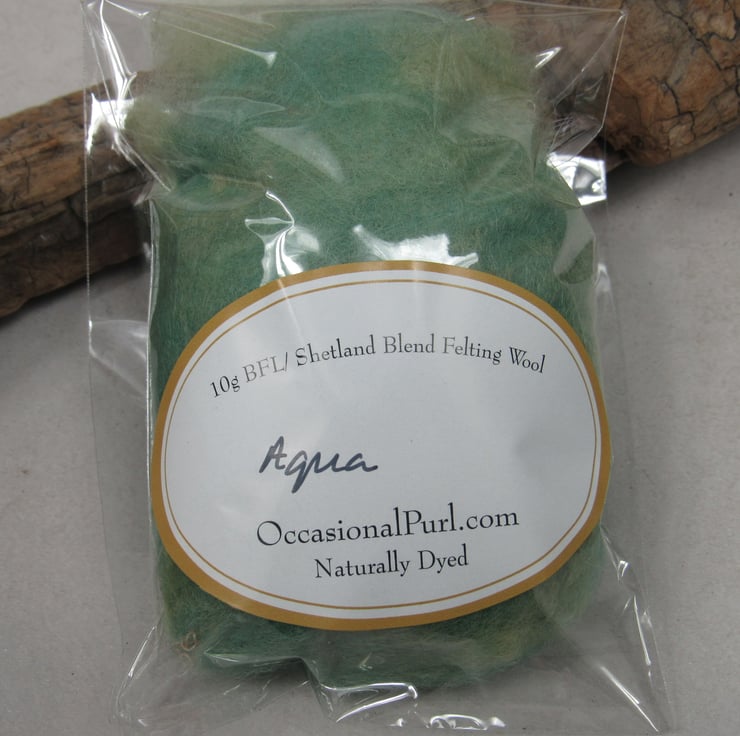 10g of blended Blue-Faced Leicester (for texture and crimp) with Shetland (for smoothness) wool naturally dyed and ready for felting, spinning or weaving.