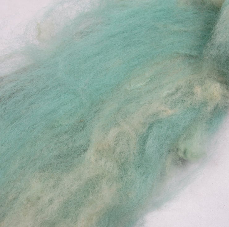 The fleece was cleaned, washed and carded here in North Wales before being kettle dyed with indigo and pomegranate to a pretty pale green