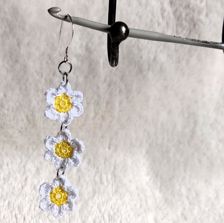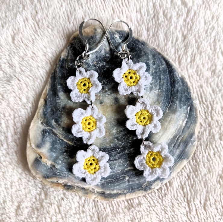 These pretty earrings are guaranteed to put a smile on your face. Each earring has three little white flowers in a line, with each flower having six petals and the characteristic bright golden centre. Despite the number of flowers, the earrings remain very light and easy to wear.