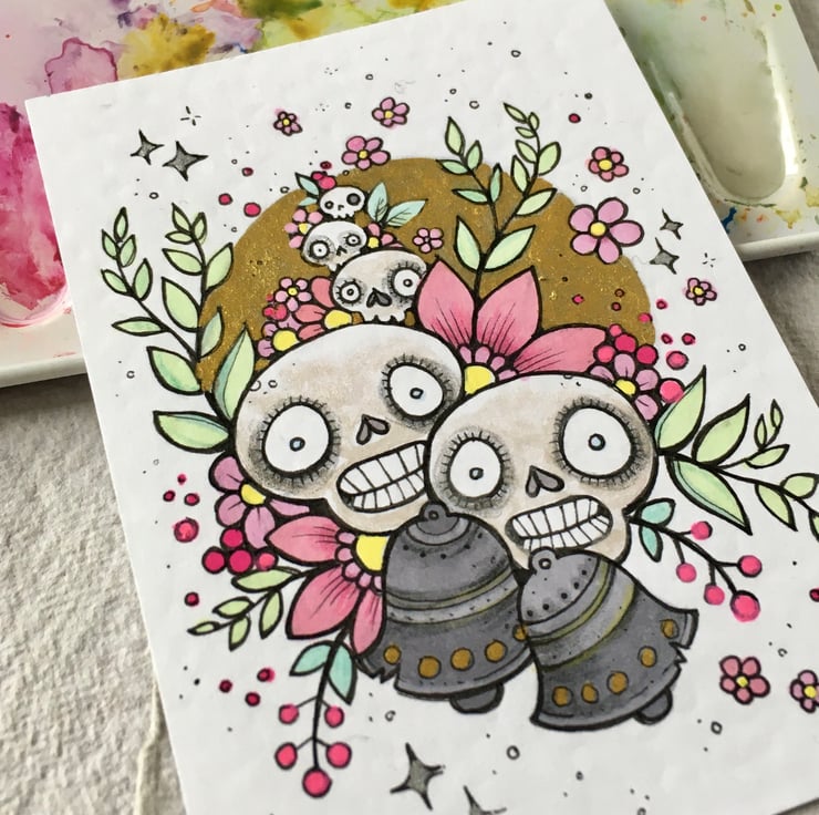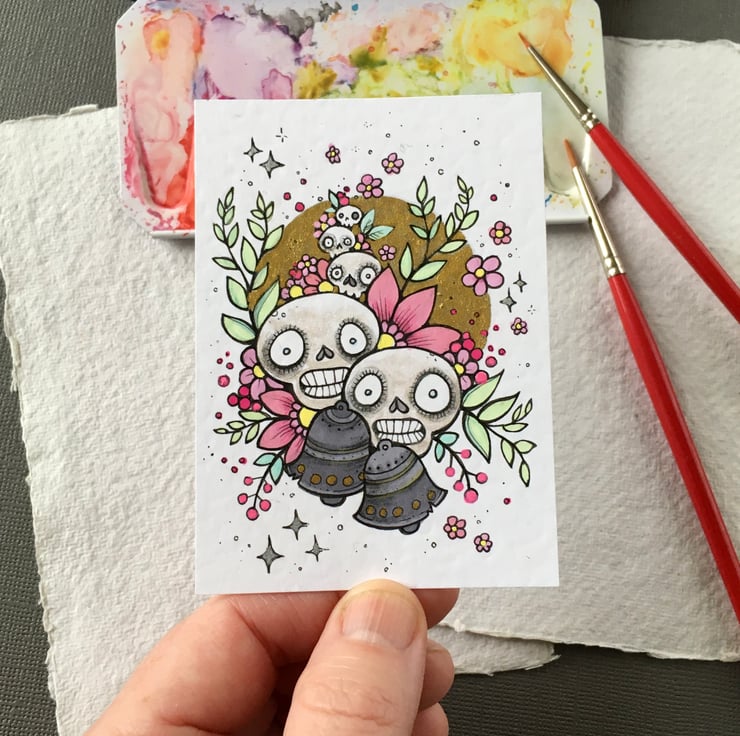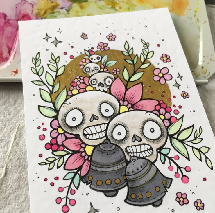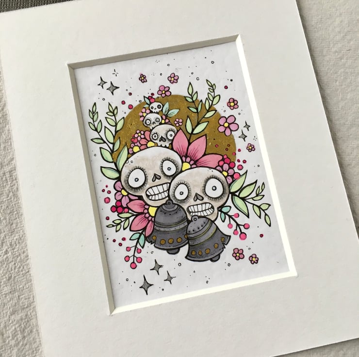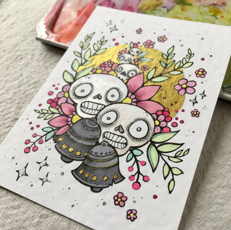 original hand drawn artwork, on textured white 300gsm cardstock. drawn with a tiny 0.05 nibbed pen, and carefully coloured with metallic gold paint, watercolours, art pens and pencils.