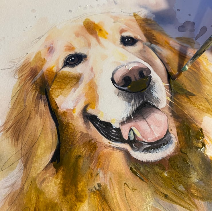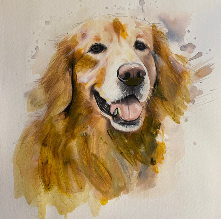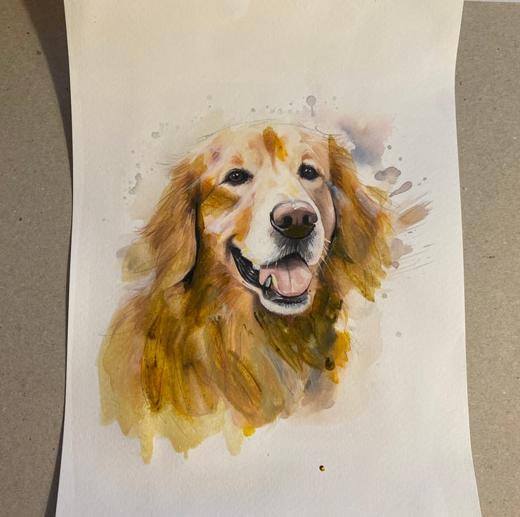 A painting of a happy smiley golden retriever using a mixture of watercolours, acrylic paints, mechanical pencil, coloured pencils and a bit of Indian ink.