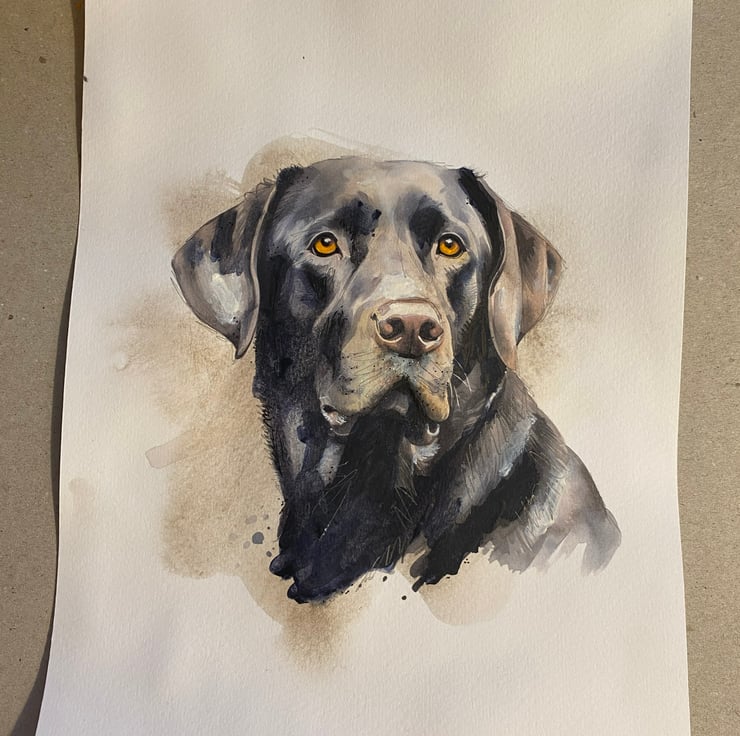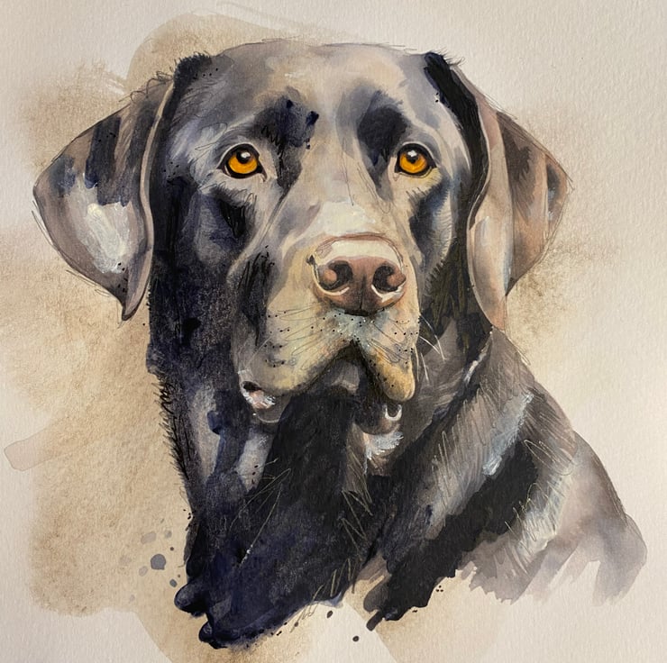 A painting of a peaceful black Labrador using a mixture of watercolours, acrylic paints, mechanical pencil, coloured pencils and a bit of Indian ink.