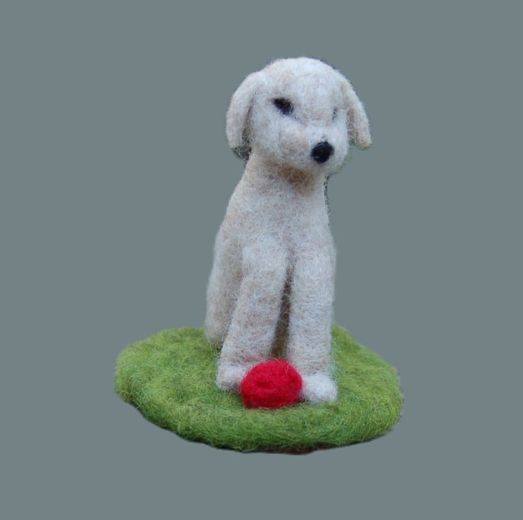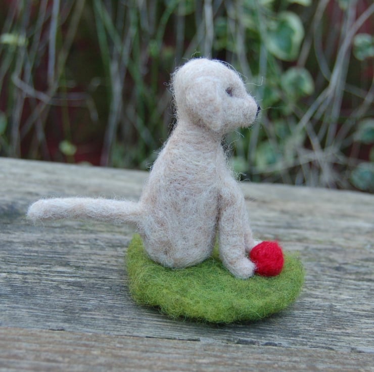 I have made this dog using wool fibres needle felted into shape and attached to a wood slice. I've based it on a Labrador dog I see on our local walks.