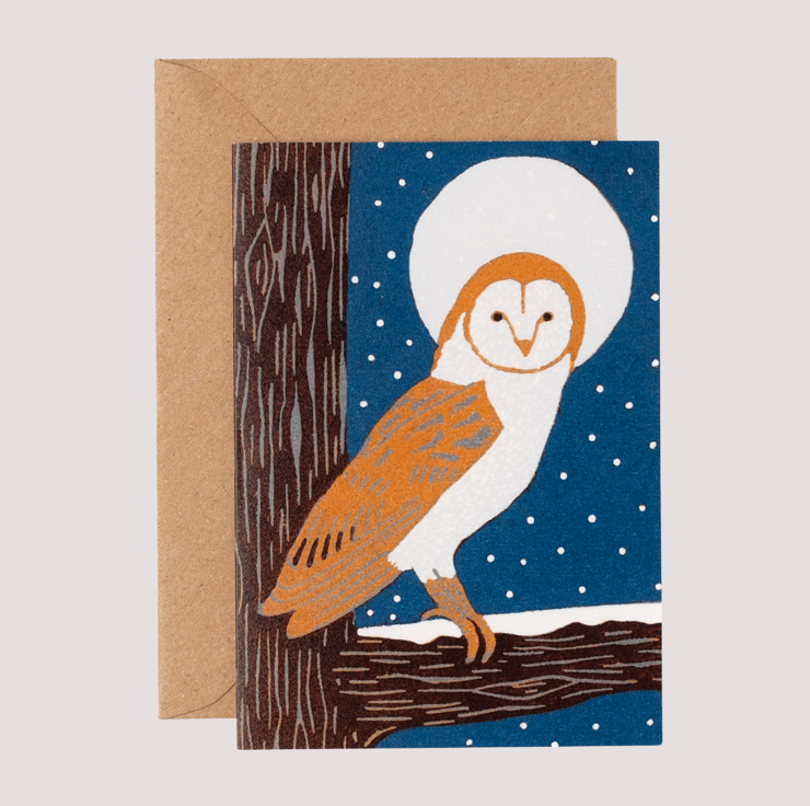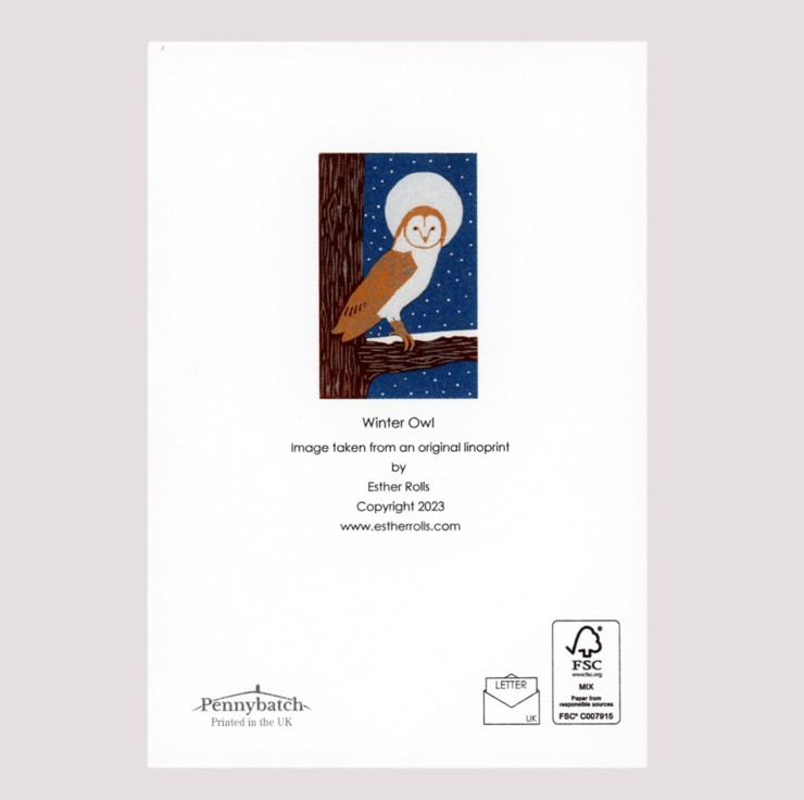 This card is a professionally printed digital reproduction of my original lino print of a Barn Owl on a snowy night.