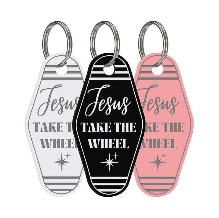 Add a dash of divine comedy to your daily drive with our 'Jesus Take the Wheel' motel-style acrylic keyring. This humorous keychain combines retro motel vibes with a chuckle-worthy twist, making it the perfect quirky gift for those who find humour in life's journey.