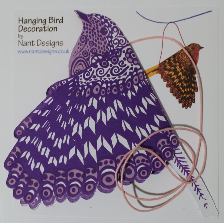 This bird is in mauve and purple with a pink hanging cord.