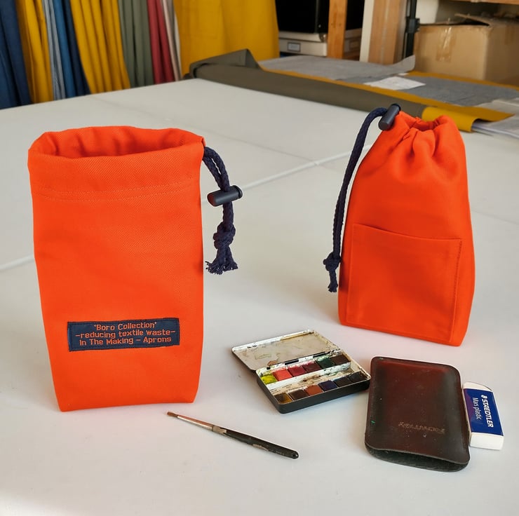 This bag is made with fabric remnants leftover from making orange No4:5 potters aprons reducing textile waste - inspired by the concept of Japanese Boro preserving and repurposing fabrics.