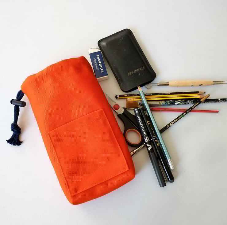 KEY FEATURES: Tough cotton drill - Fits variety of pens, carving tool sets up to 20cm/8" long - Outside pocket - Drawstring closure secures with spring loaded cord lock - Washable - No waste - Sustainable making - Made-to-last