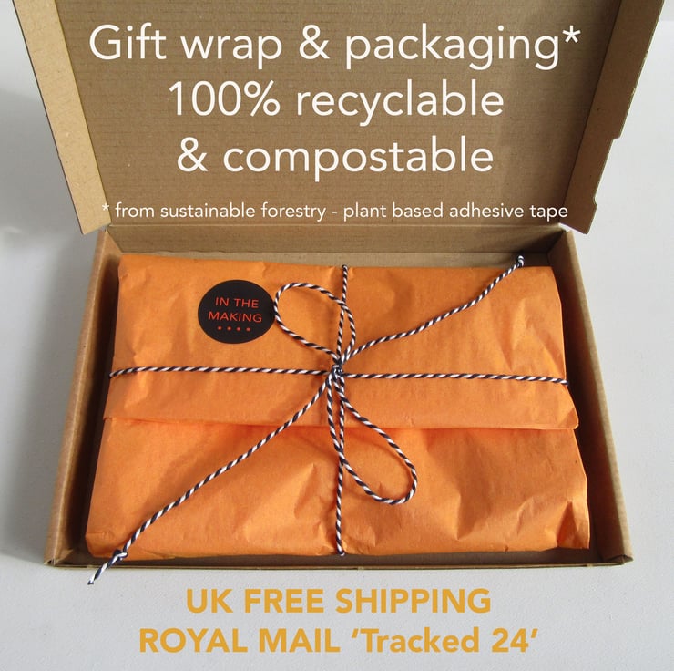 POSTAGE & ECO PACKAGING: (UK) Royal Mail Tracked 24 - (USA) International Tracked N.B.International orders may be subject to customs/state taxes on delivery. Plastic-free gift wrap & packaging: 100% recyclable paper & box, paper parcel tape with natural rubber based adhesive fully recyclable & compostable.