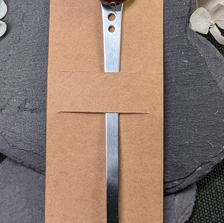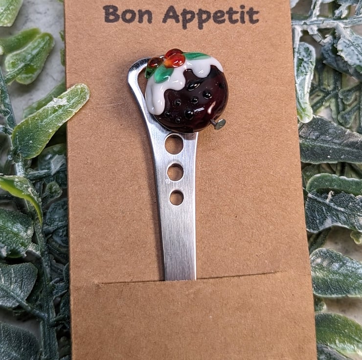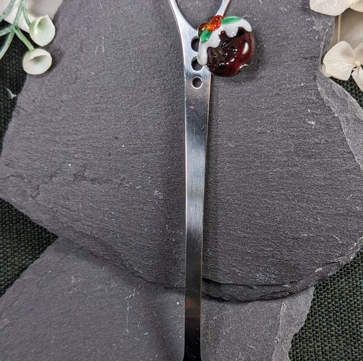 The Christmas pudding bead has been created by melting layers of glass onto a mandrel and then pressing into shape. I have then added little black dots of glass (for currants) and white glass for the icing, ensuring the white glass 'icing' has a dripping effect. To finish the Christmas pudding I have added red and green glass for the holly. The bead has been attached to the spoon using a stainless steel headpin.