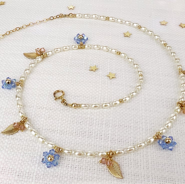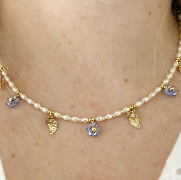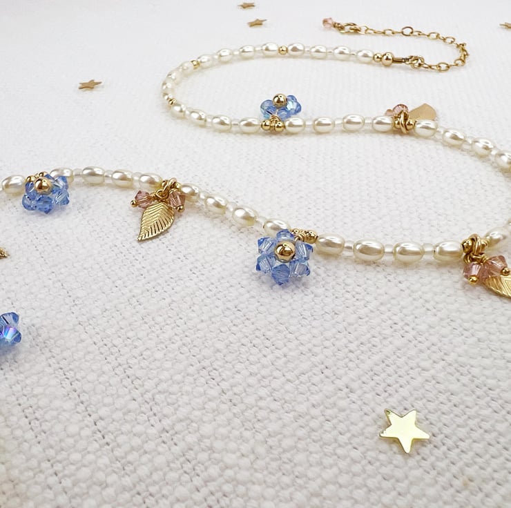 Inspired by a vintage piece given to me by my mum, this dainty forget me not necklace is perfect for adding a pretty floral touch to your look. Each tiny flower is individually handmade from tiny sparkling Austrian crystals and strung onto a necklace of crystal pearls accented with dainty golden leaves and soft pink crystal "buds". This piece is designed to sit a little higher up on your neckline to show off all the tiny details but it can be extended to 17.5 inches in length.