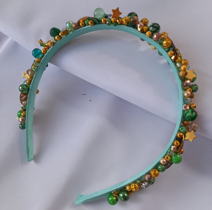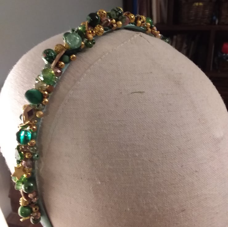 A headband with green and gold beads gems Rhinestones, charms. All sewn on to a 10mm stainless Steel 5mm ribbon covered headband. P&P included in price.