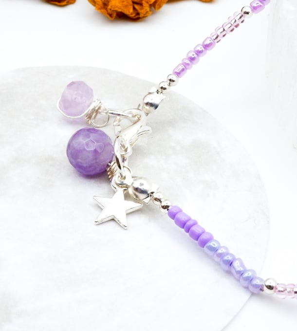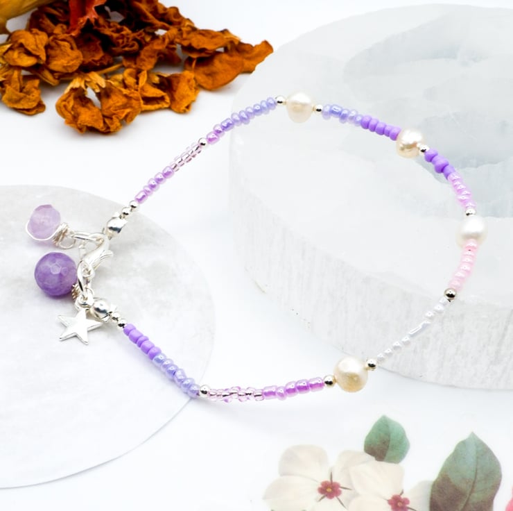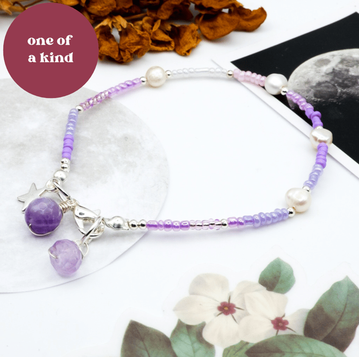 This pretty bracelet has been handmade with lots of love in the East Midlands using sterling silver components, including round accent beads, freshwater ivory baroque pearls, amethyst gemstone charms, and a dainty silver star.