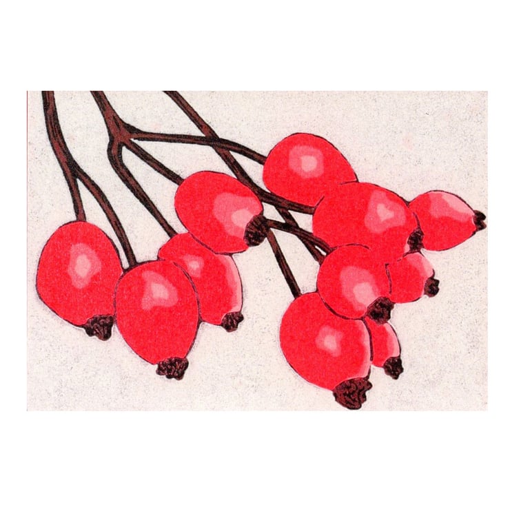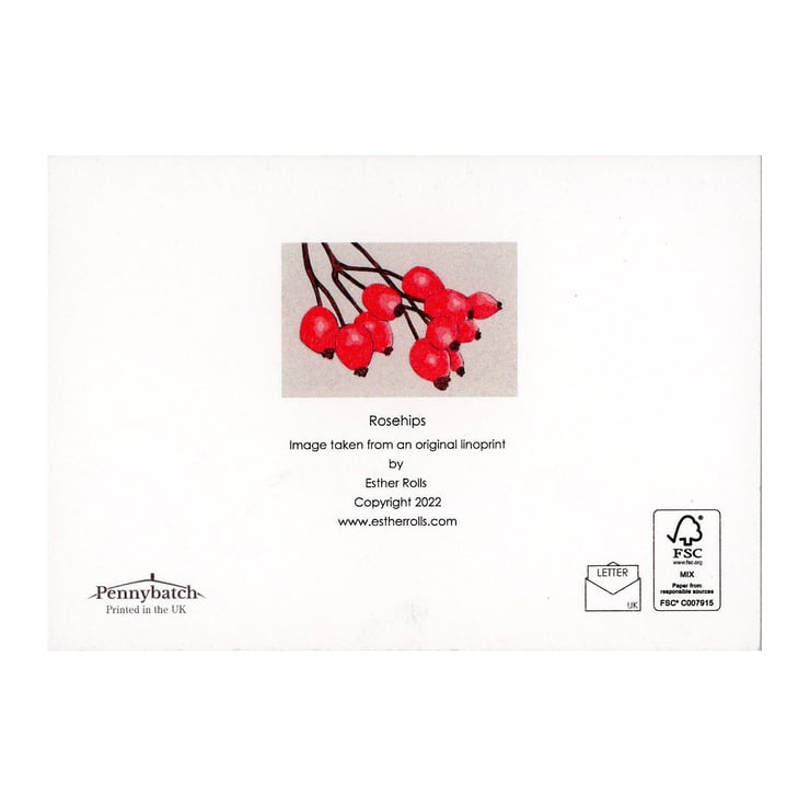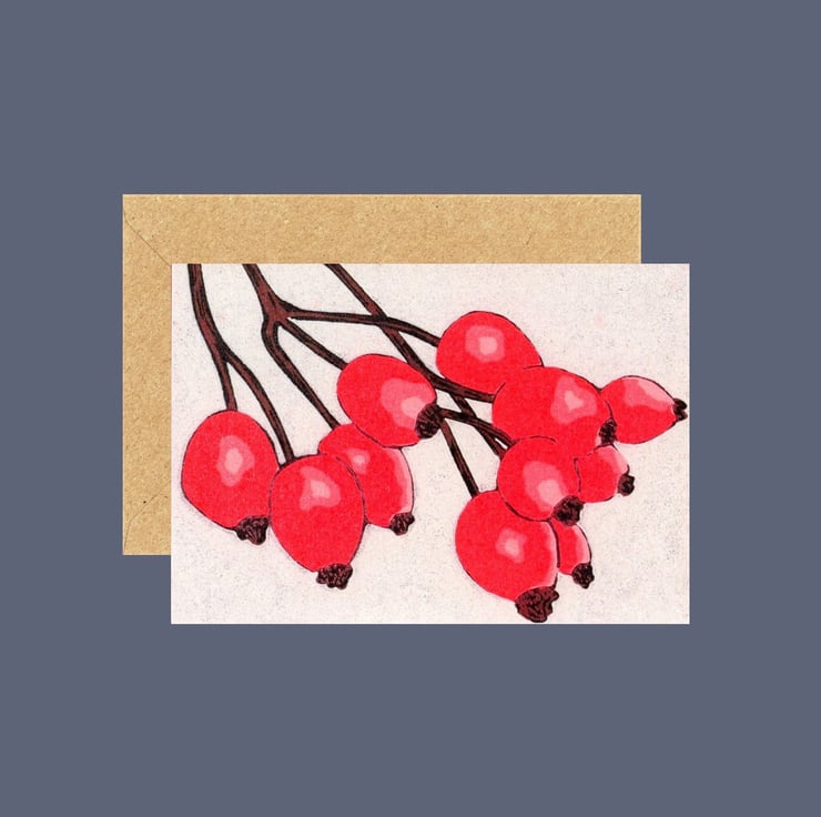 This card is a professionally printed digital reproduction of my original lino print of Rosehips.