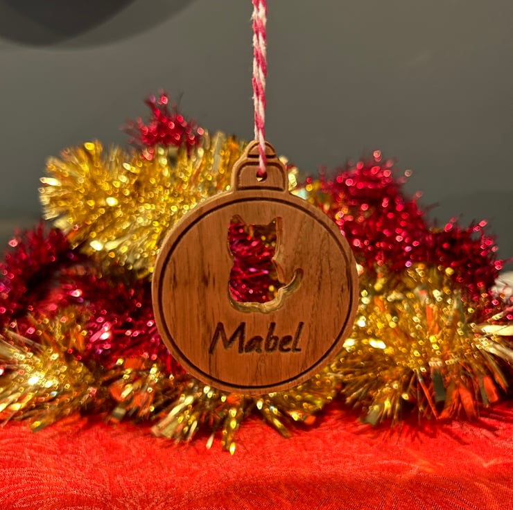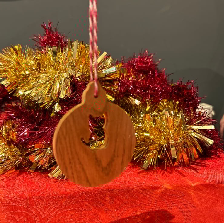 This hand made Christmas Tree Decoration is made from solid, kiln dried, European Oak. Each bauble is hand finished and a coating of clear lacquer has been applied. The hanging thread is red and white candy cane rope. The cat detail has been completely cut out. Can be personalised or left blank.