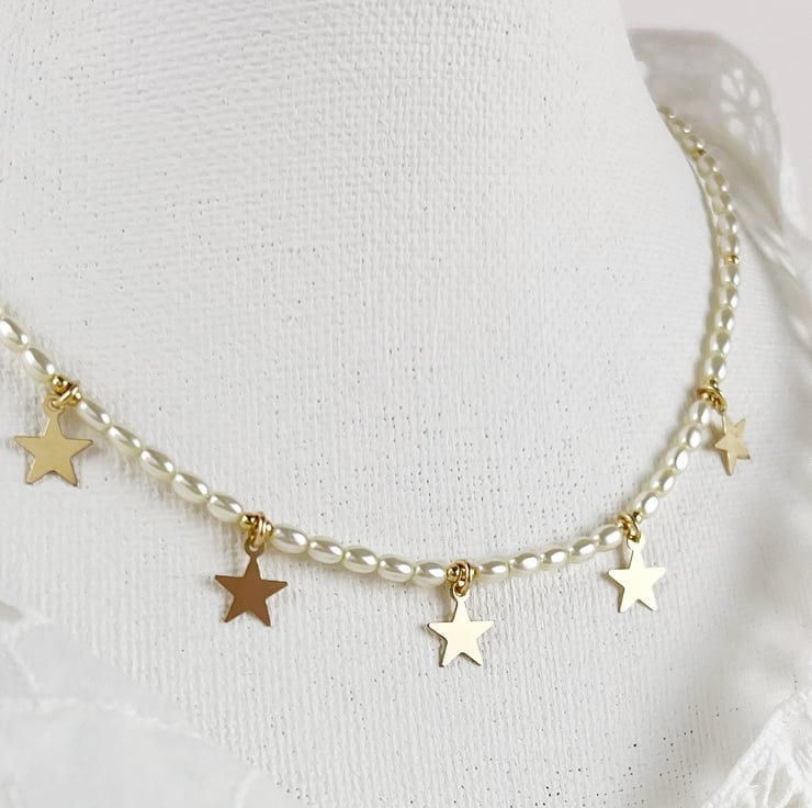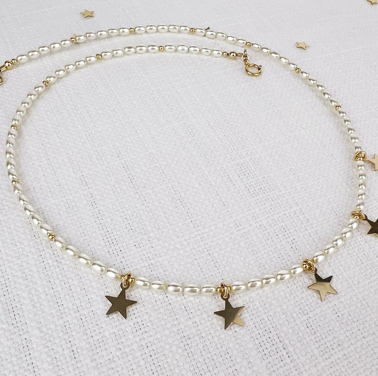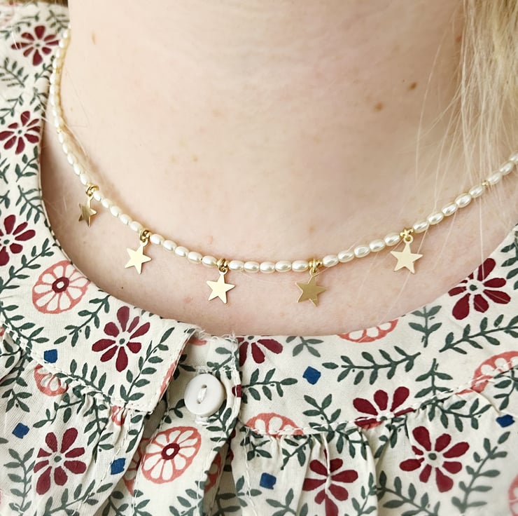 Delicate and whimsical, this pretty pearl necklace has been accented with dainty gold stars that move and twinkle in the light. Perfect for adding a touch of magic to knitwear, blouses or your favourite dress. Handmade with cream Austrian crystal pearls, this lovely design glows and twinkles subtly. Designed to sit a little higher on the neckline at 17 inches in length, it looks beautiful when worn alone but its also perfect for layering for a more eclectic feel.