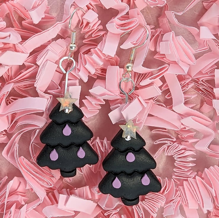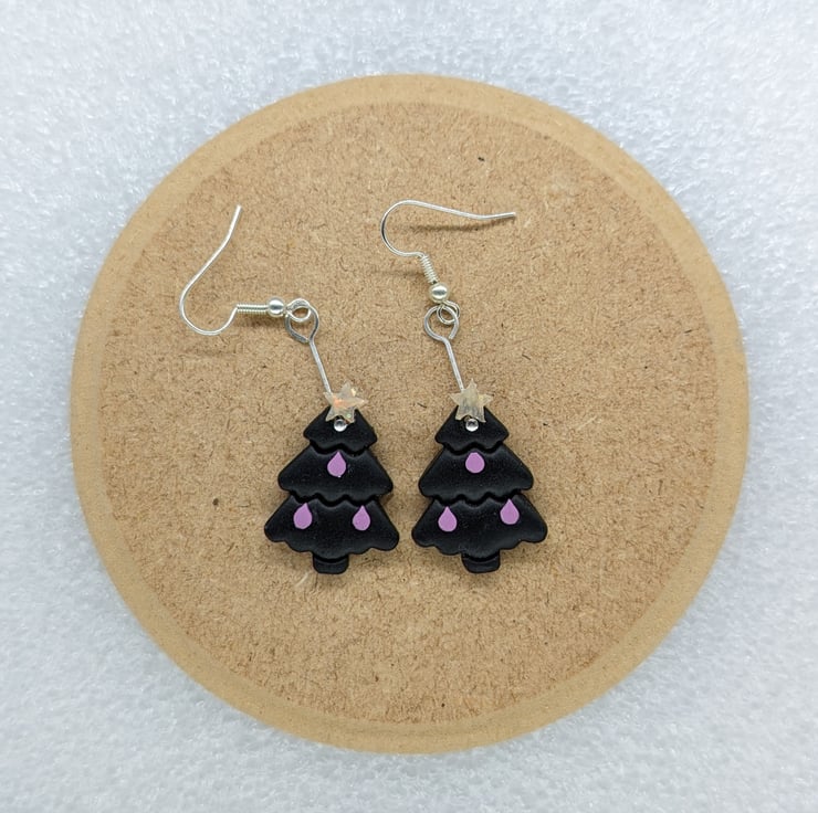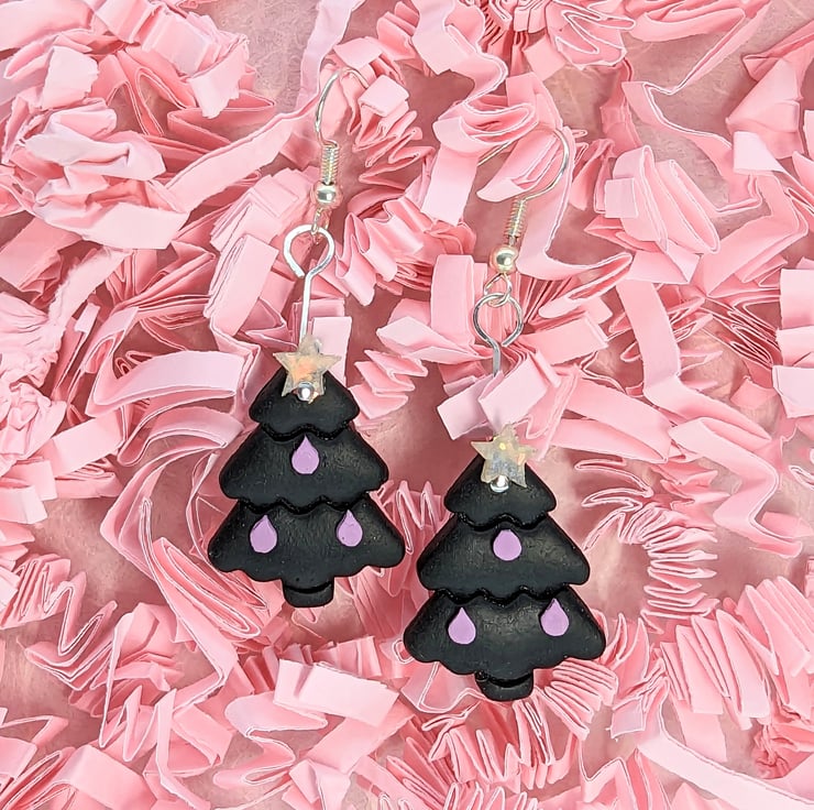 Black Christmas tree earrings with lilac baubles and a sparkly white star.