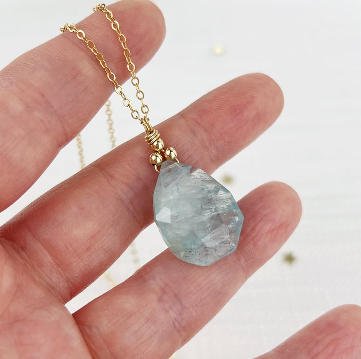 A simple but beautiful necklace featuring a faceted aquamarine pendant in the most gorgeous pale turquoise-blue. This stone has a lovely rustic feel with lots of inclusions inside and on the surface for a natural, bohemian feel. I always find it fascinating to look inside included stones with their variations in colour and clarity. I've opted for simplicity with the design to really show of the stone, it's a minimal style that will work beautifully with lots of looks and is perfect for layering too. I've added a longer chain too but it can shortened if you prefer.