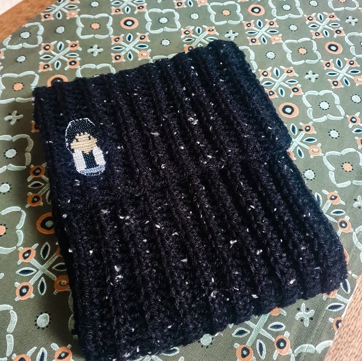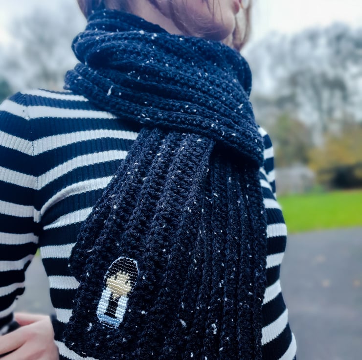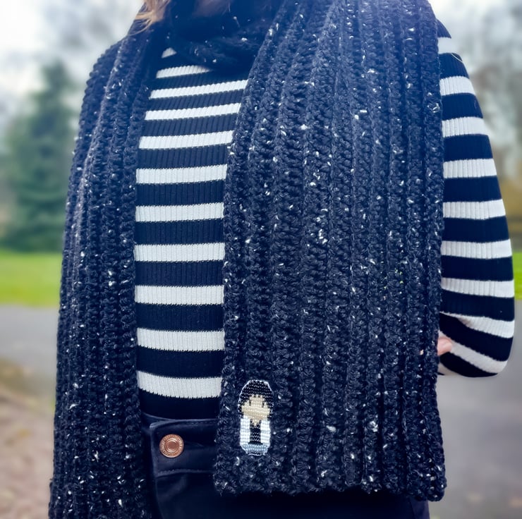 A lovely warm medium thickness black crochet scarf made from 5% wool yarn. Amaizing extraordinary yarn with white spots.