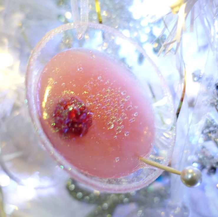 This great little 3D pink cocktail hanging ornament comes in a mini martini glass with a resin filling and fake raspberry garnish with rainbow bubbles and pearl topped swizzle stick. and a glitter rim. Hangs from a white gauze ribbon.