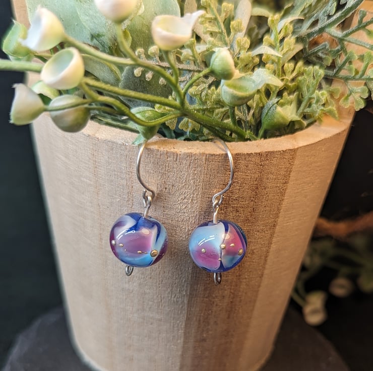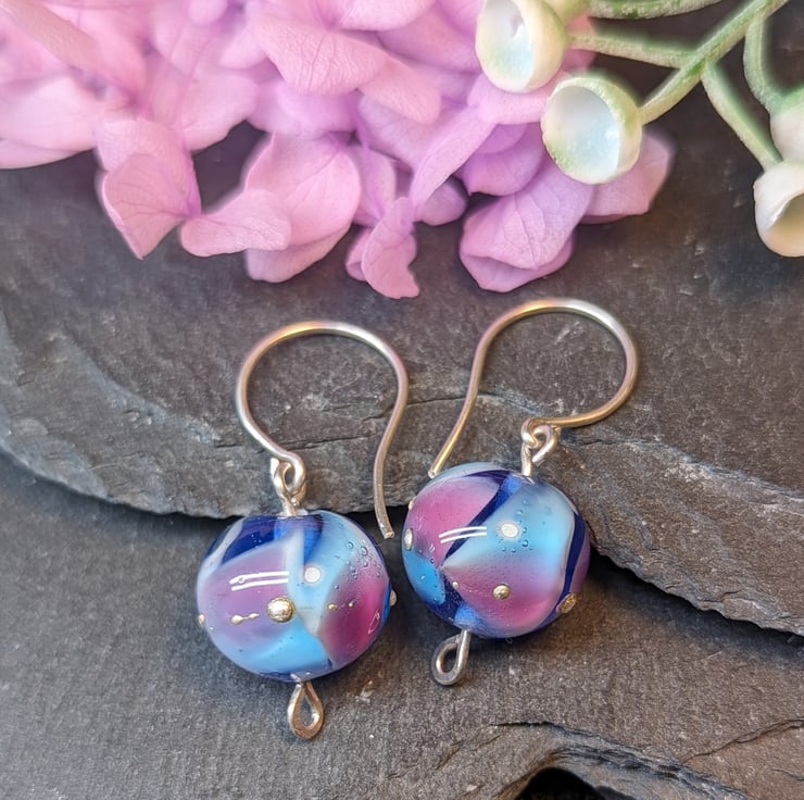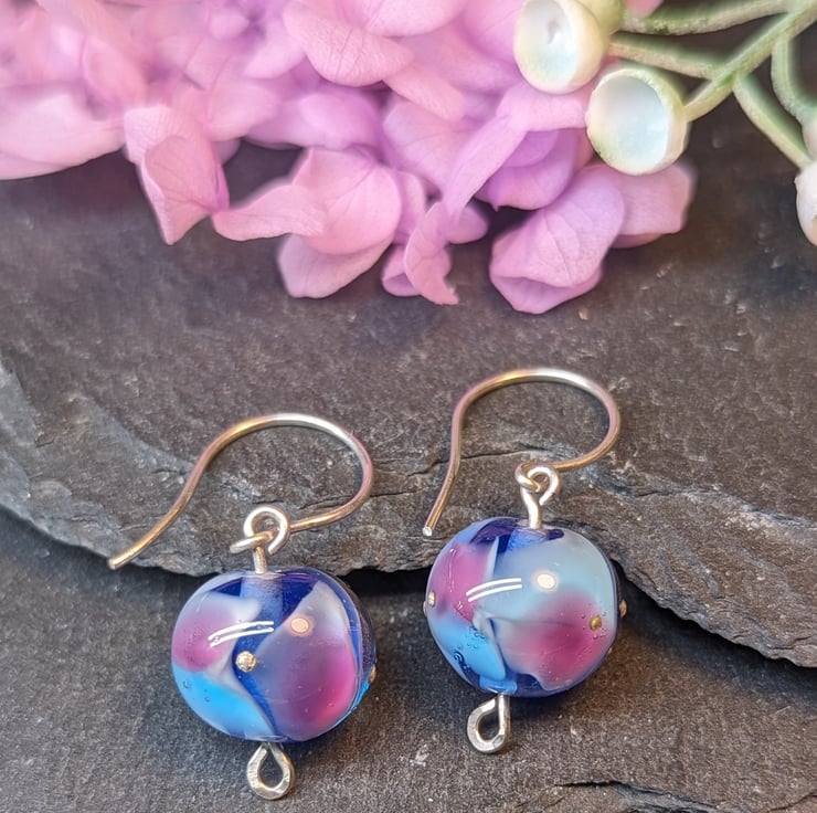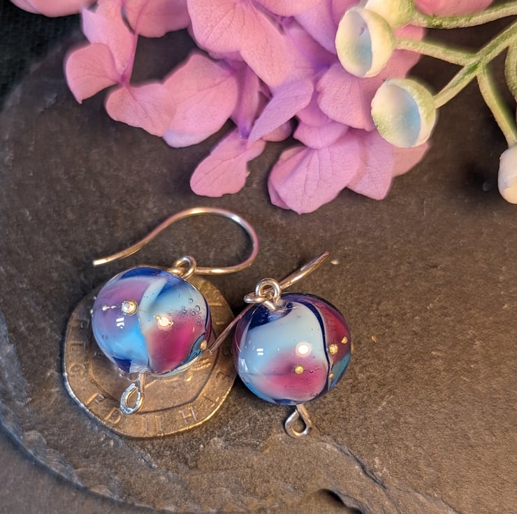 A bespoke pair of blue and pink swirling lampwork earrings with fine silver embellishment. The lampwork beads start life as simple glass rods that I melt in the flame and onto mandrels. I then add layers of glass and continue to melt and shape in the flame. These beads have been encased in transparent glass to give them depth.