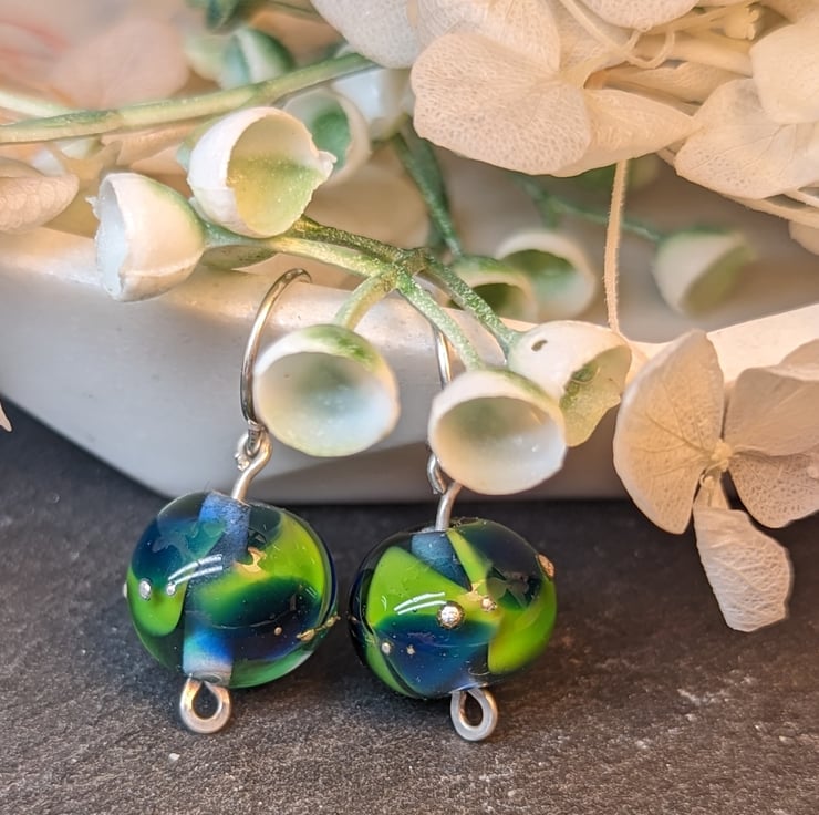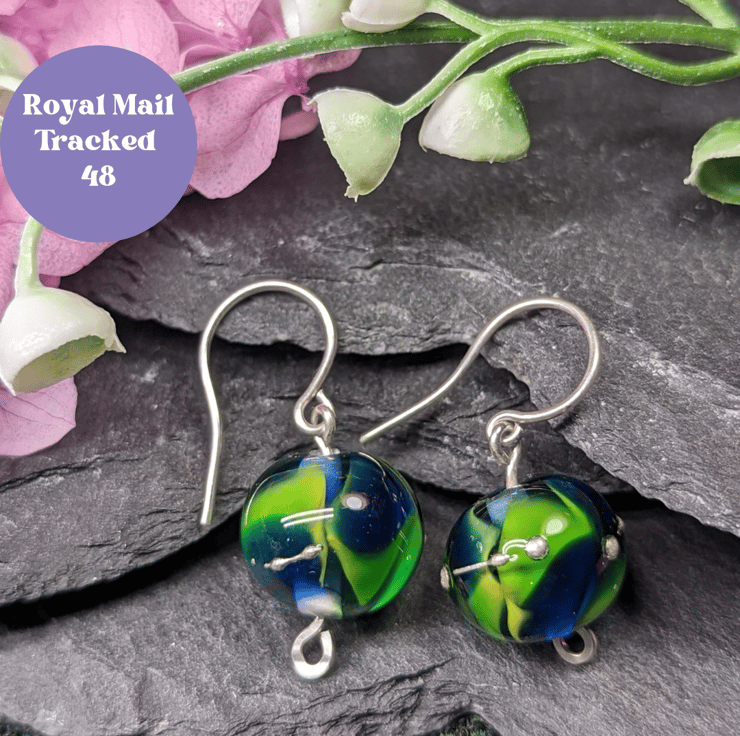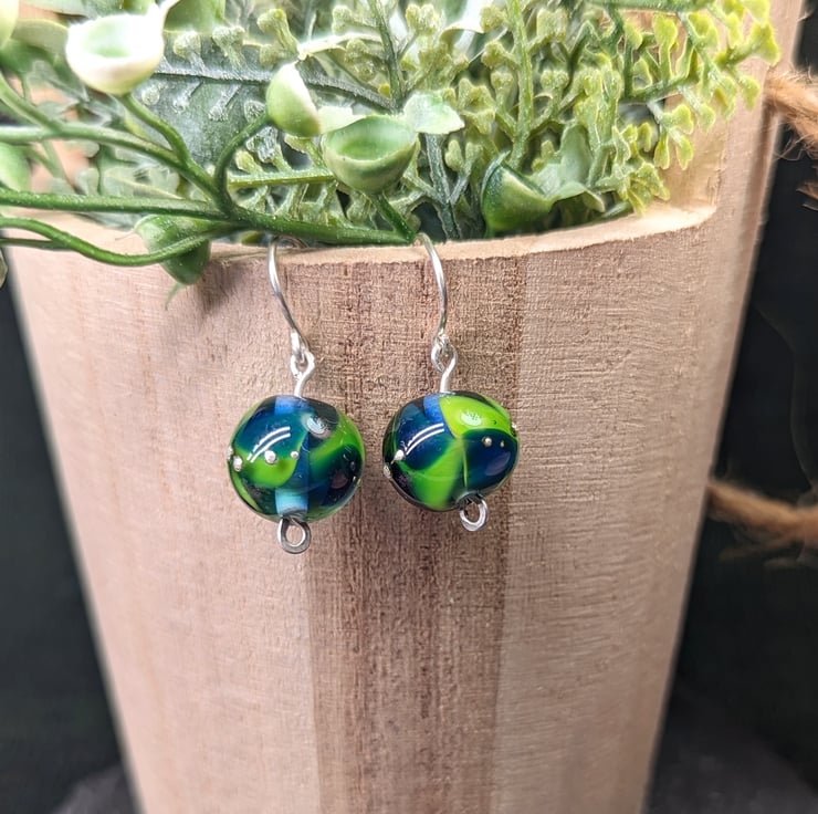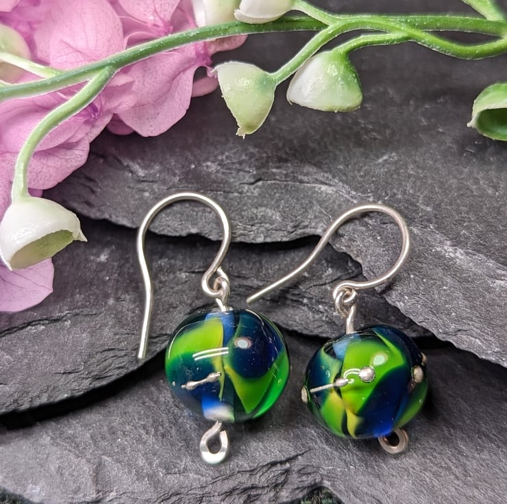 A bespoke pair of blue and green swirling lampwork earrings with fine silver embellishment. The lampwork beads start life as simple glass rods that I melt in the flame and onto mandrels. I then add layers of glass and continue to melt and shape in the flame. These beads have been encased in transparent glass to give them depth.
