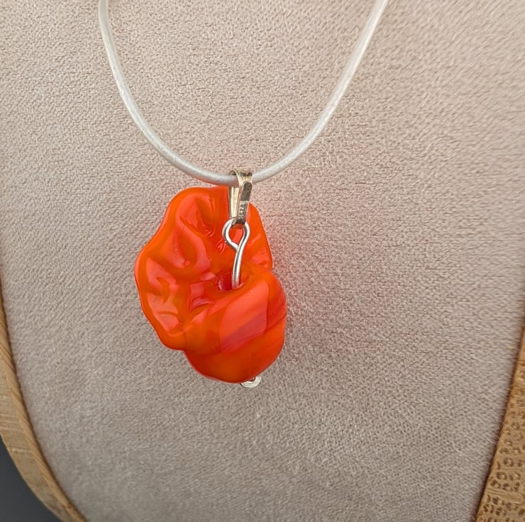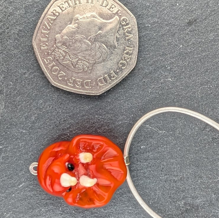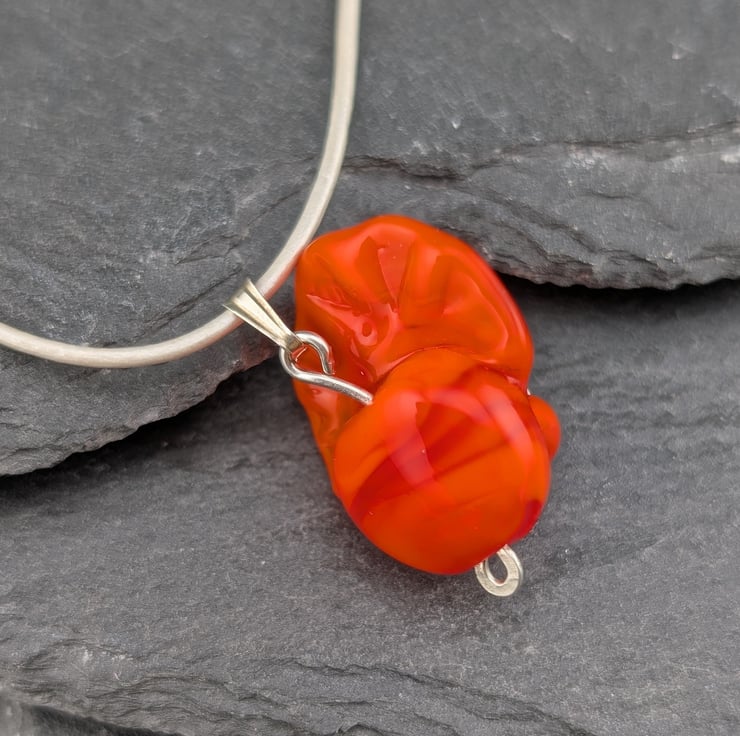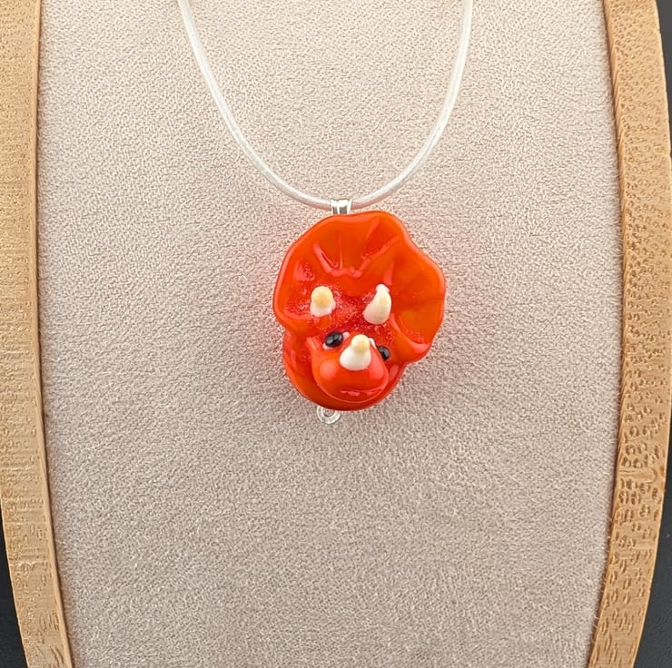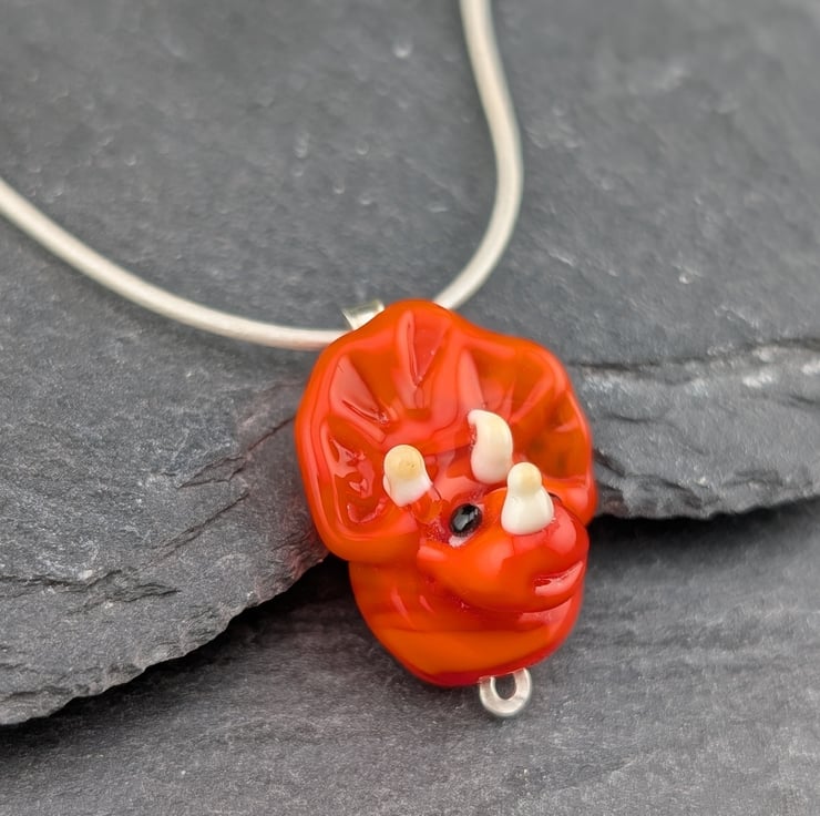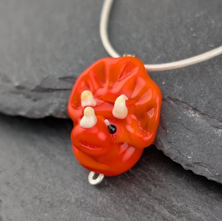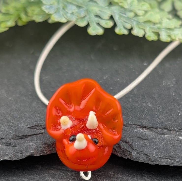 A bespoke lampwork dinosaur pendant in a lovely orangery colour. The glass bead was created by melting opaque glass rods in the flame and then shaping into a dinosaur.