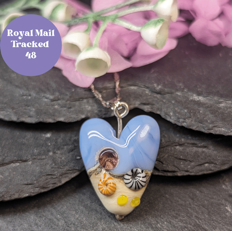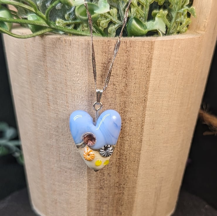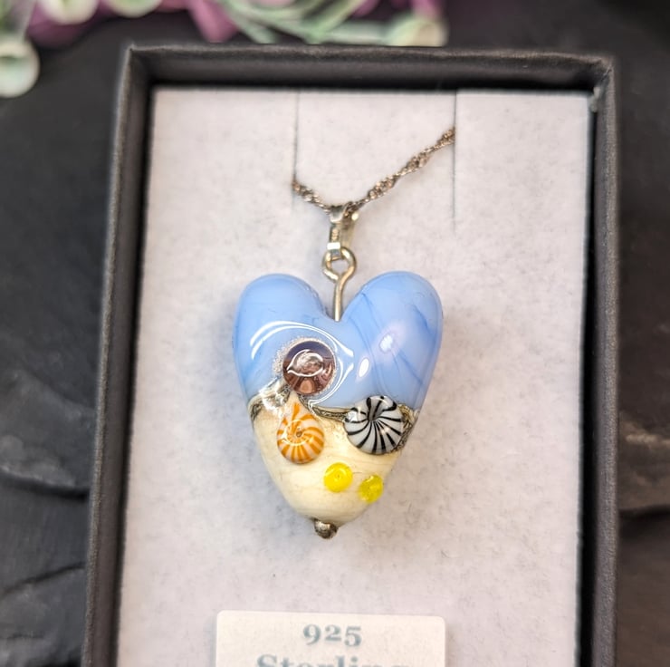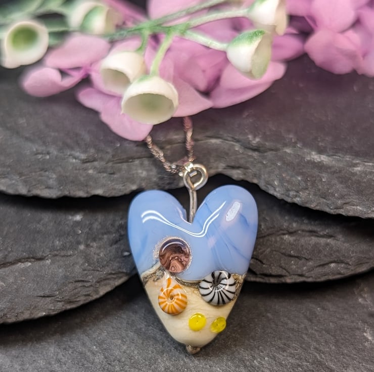 A bespoke lampwork heart glass pendant featuring a sand and sea design.