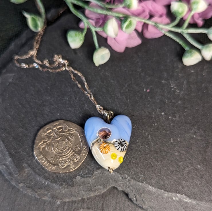 The lampwork bead was created by carefully melting layers of ivory and sky blue glass and then pressing into a heart shape. An ivory silvered stringer has been added to the "sand" and little murrini pieces melted on top to emulate shells and sea creatures.