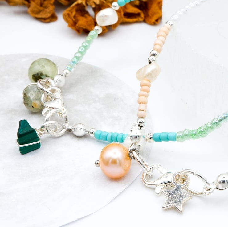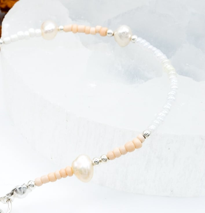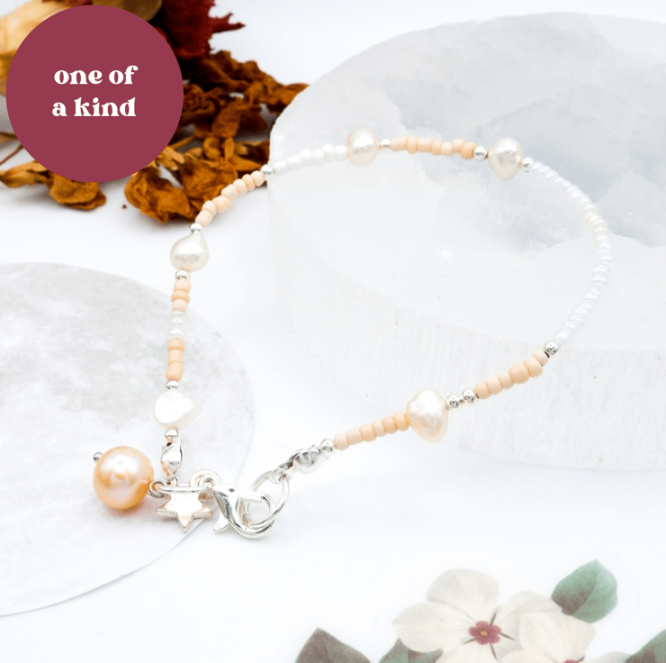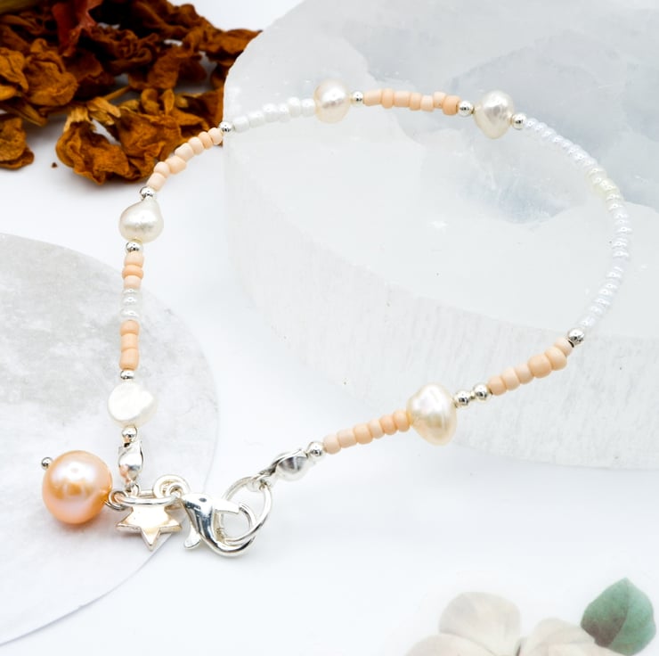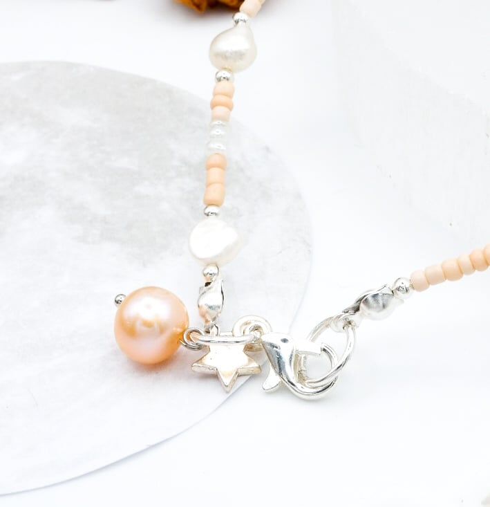 We've used beautiful quality peach and white coloured Czech glass seed beads, sterling silver components including round accent beads, a large peach pearl charm pendant, and a dainty silver star.