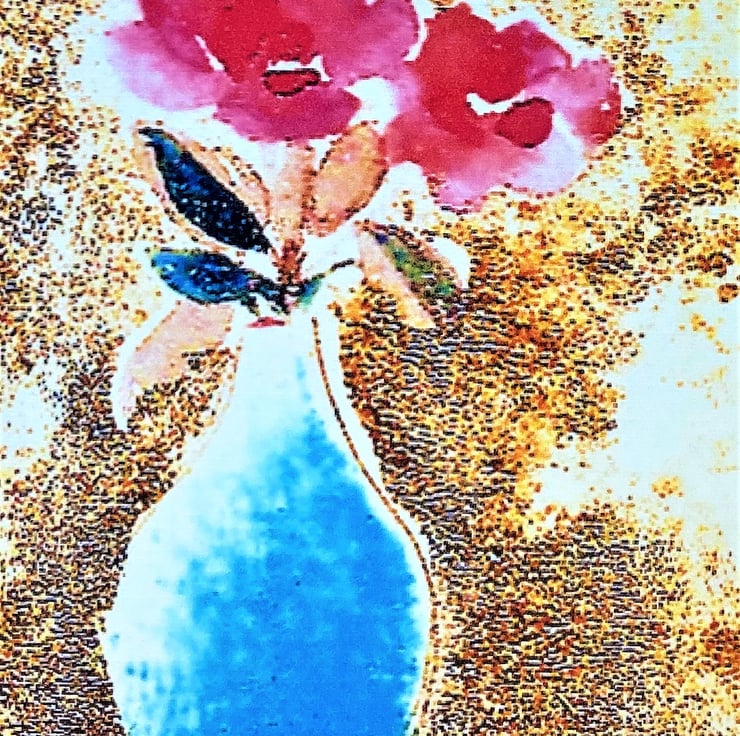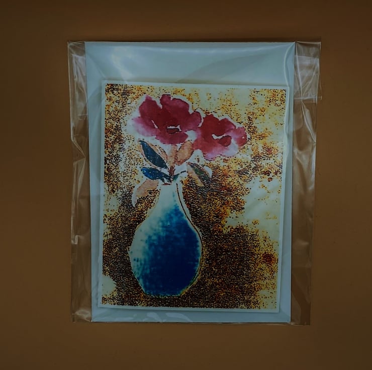 Taken from one of my original watercolour paintings this little Birthday card is a colourful way to send Birthday greetings. The card shows a floral arrangement with vivid pink flowers in a bright turquoise vase. The colours are flamboyant and contrast well with the brown ochre background. The card image is manipulated to give a slightly distorted finish which lends air of sophistication to the print.